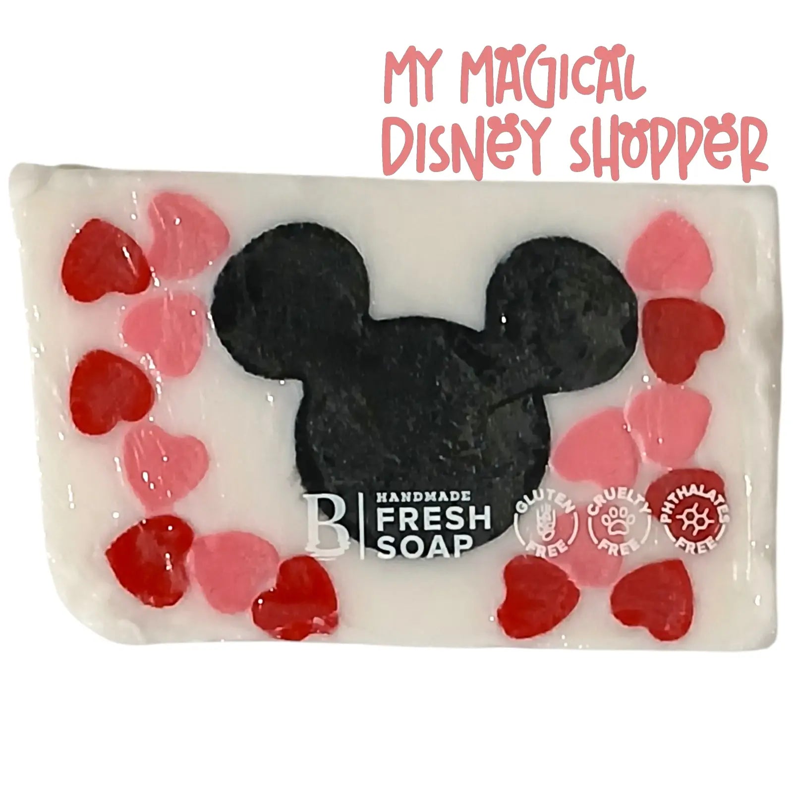 Refresh your senses with our I HEART MICKEY Fresh Cut Soap from Basin. This watermelon and pear fragranced bar features pink and red hearts surrounding the iconic Mickey shape in a milky white background.