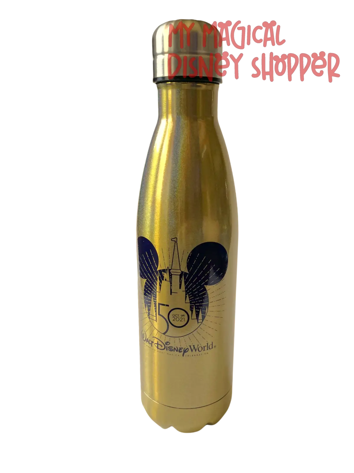 Have some fun in the sun with this Opening Day 50th Anniversary Iridescent Gold Insulated Water Bottle. Features 50 with Castle on front with October 1st 2021 and Walt Disney World "The World's Most Magical Celebration" on the bottle.