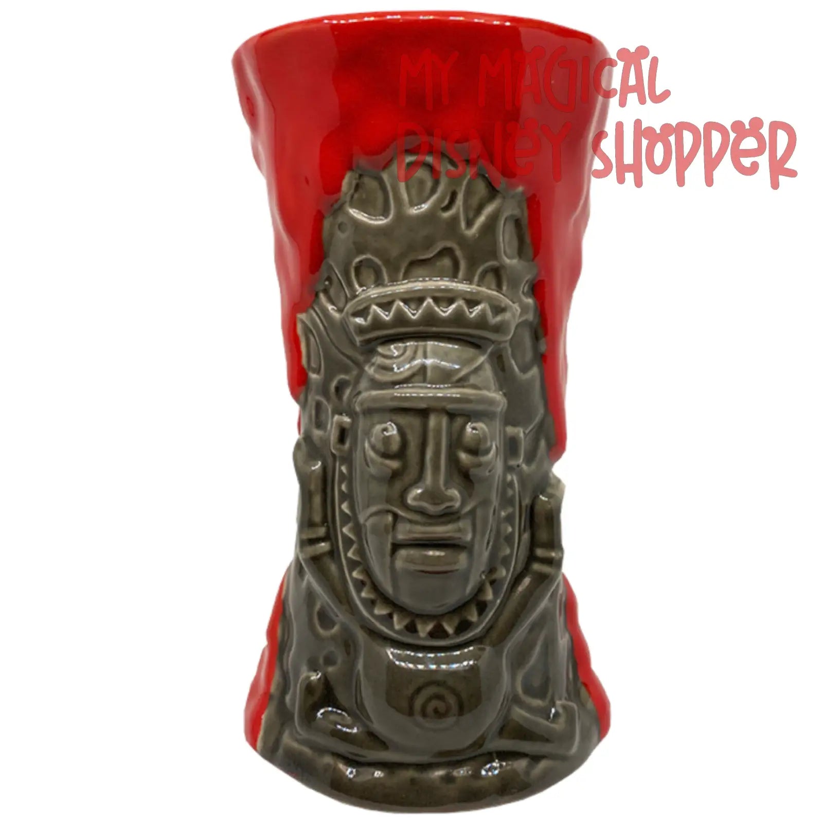 RUN FOR YOUR LIVES! The top of this mug appears to be overflowing with lava. Tiki figures adorn the front and back of this mug and both figures have their arms raised to the heavens. One is wearing a mask and the other a headpiece. Perhaps you can please the Gods by finishing this cocktail and prevent a natural catastrophe? If not, at least add a glow cube and make the contents of this tiki mug look like burning lava.