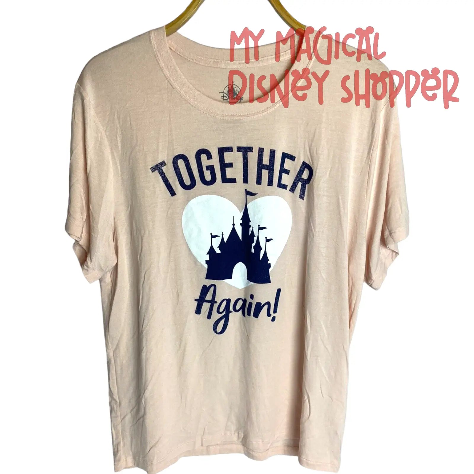 This light pink shirt features the castle front and center of a white heart, showing how much we love being together again in the Disney Parks.