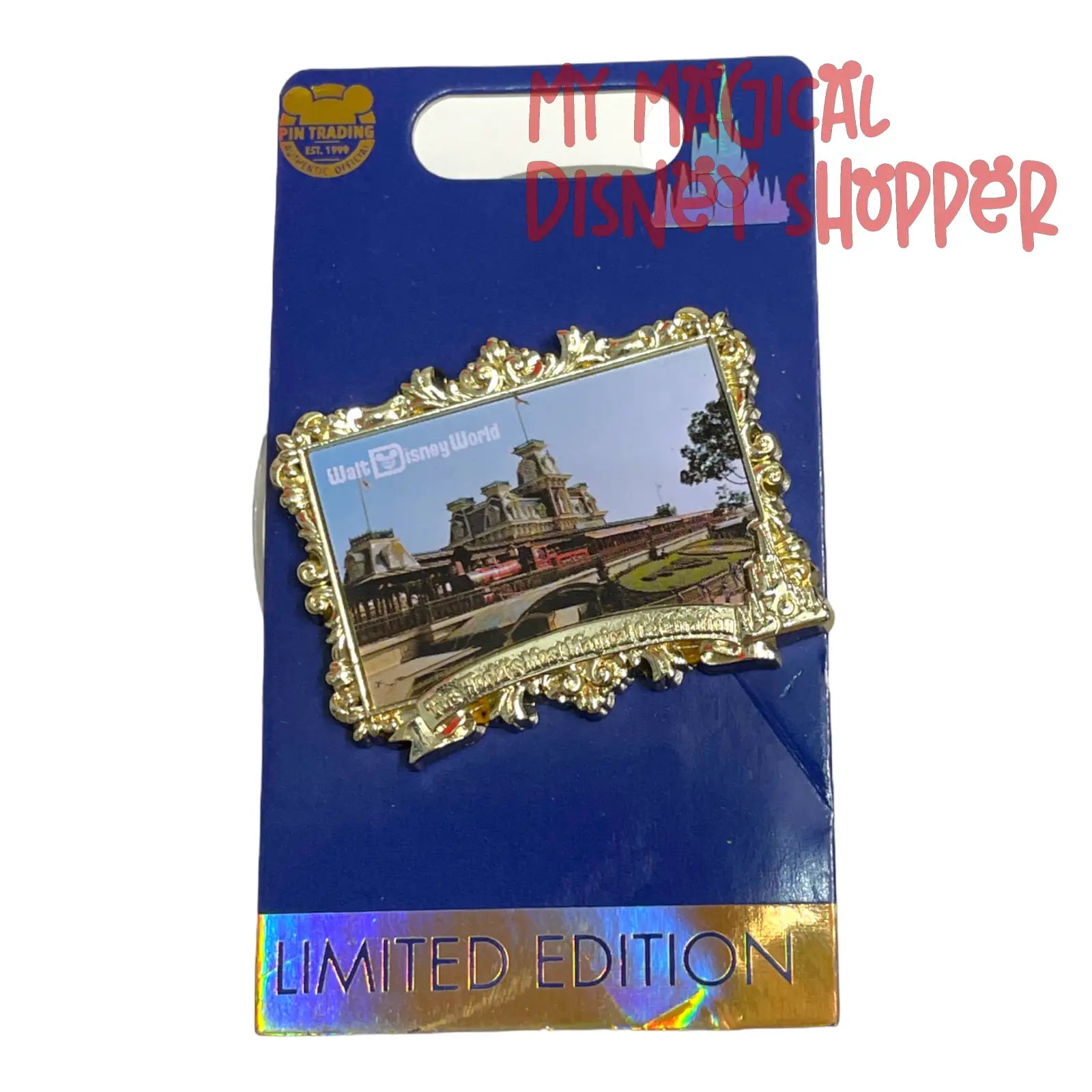 All aboard for The World’s Most Magical Celebration with this limited edition pin showcasing the iconic Walt Disney Railroad Station at Magic Kingdom. Created in honor of Disney’s 50th Anniversary, this beautifully detailed collectible is limited to only 3,000 pieces, making it a treasured addition for pin traders and Disney fans alike.