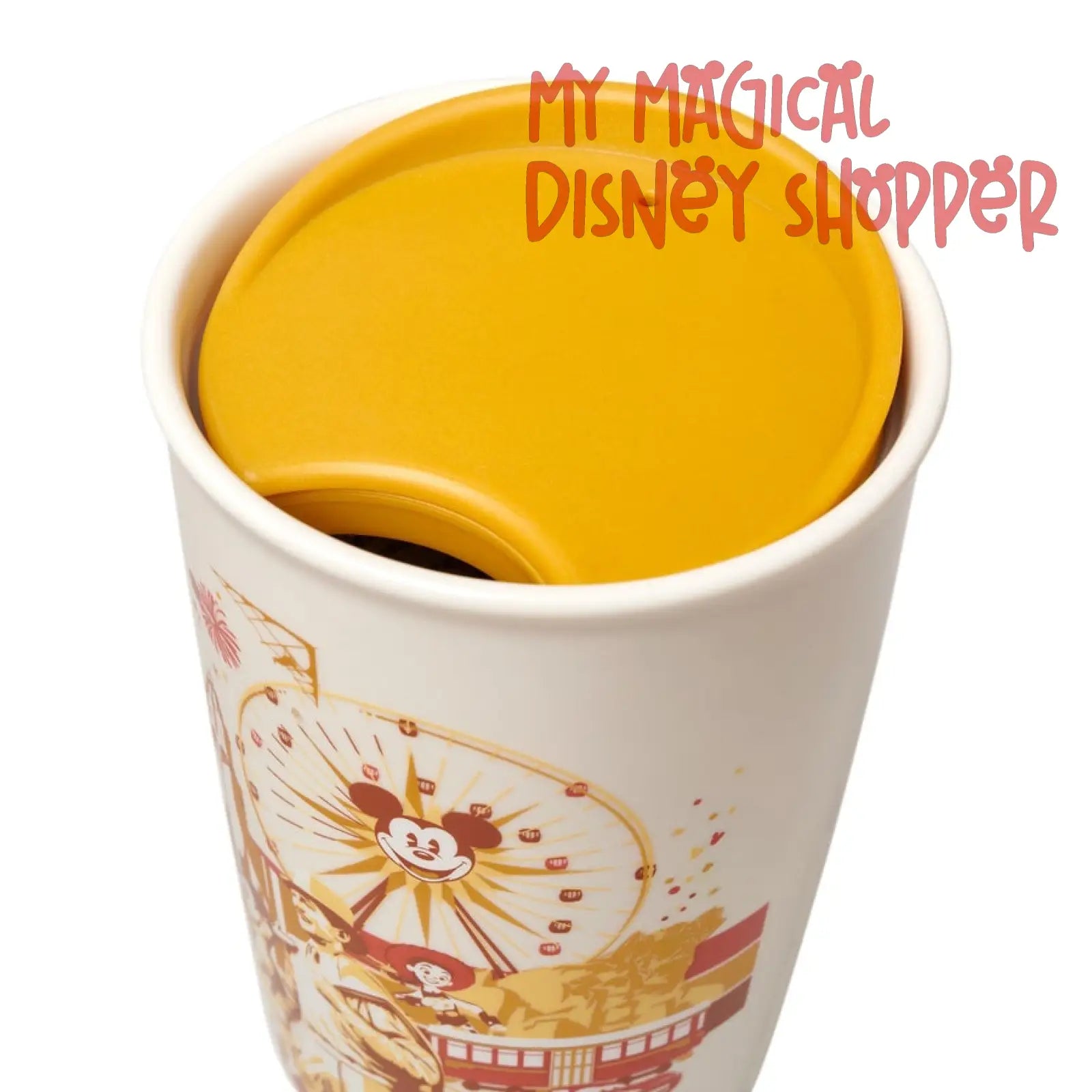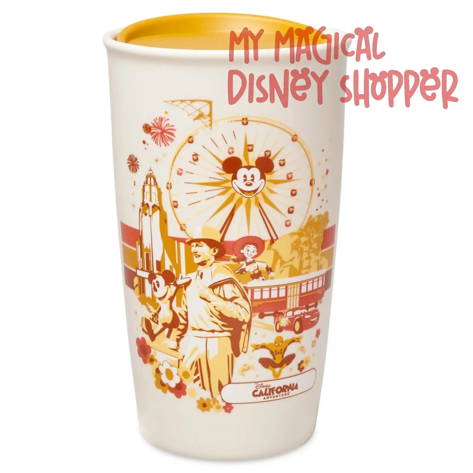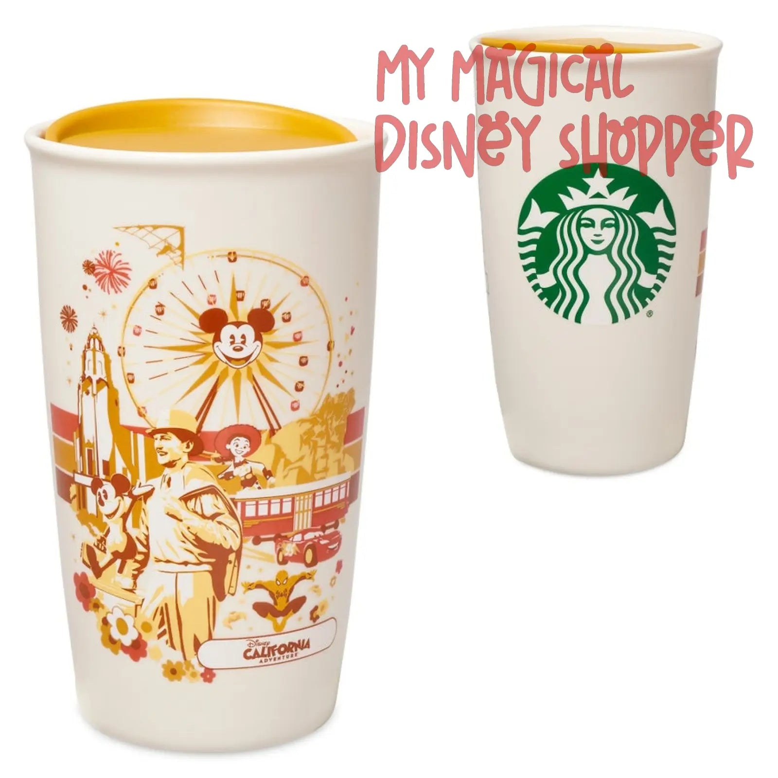 Enjoy a taste of Disney California Adventure wherever you go with this ceramic travel tumbler. Created in collaboration with Starbucks, and featuring screen art that includes Mickey, Walt, Jessie, and Spider-Man and some popular attractions, it's perfect when you want to refresh happy memories of your Park visit.