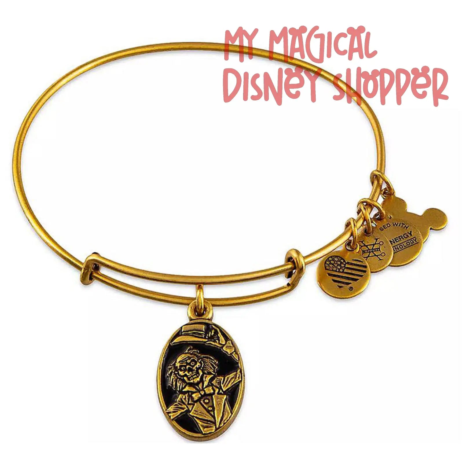 Celebrate ''50 years of happy haunts'' with this goldtone bangle by Alex and Ani. Inspired by The Haunted Mansion attraction, the engraved charm features one of the grim grinning ghosts on the back and comes on an adjustable brass bracelet.