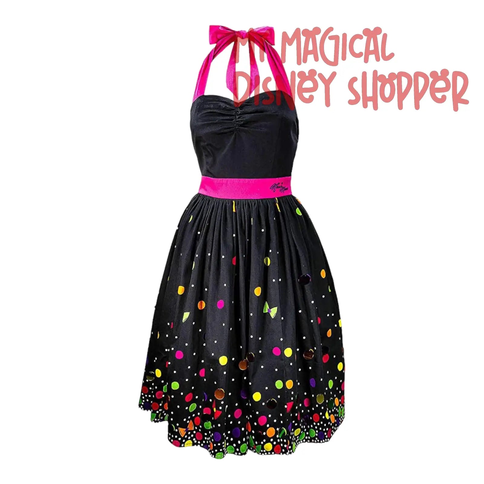 Minnie brings her colorful sense of style to this bold dress. Cascading polka-dots and bows cover the black skirt while the bright pink halter neck straps and waistband provide a vibrant contrast that will turn heads and raise a smile.