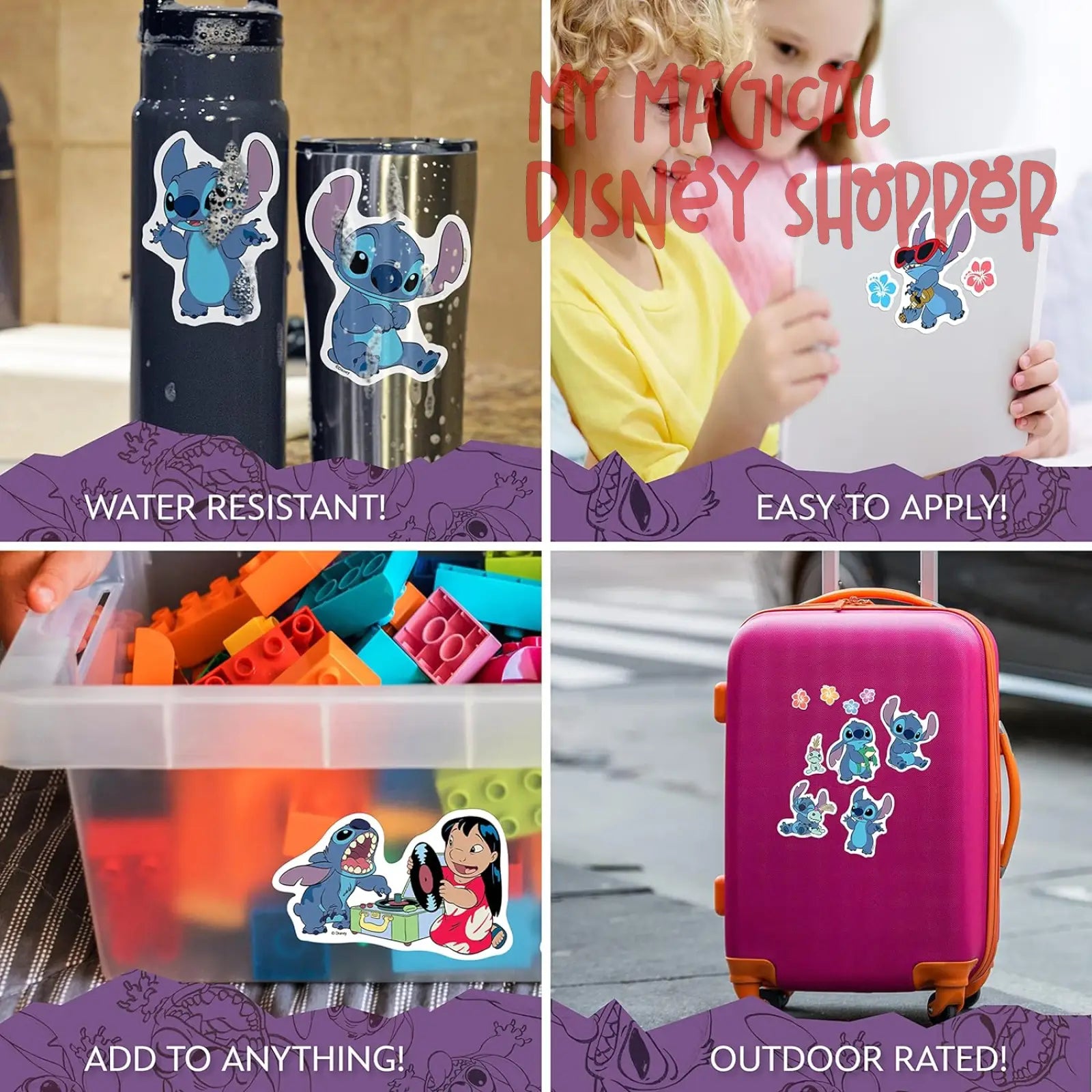 Our Lilo & Stitch decals look great on any smooth surface. Decorate your water bottle, laptop, lunchbox, or even your skateboard! Our fun stickers are a great way to personalize your possessions. We do not recommend applying these decals to walls, check out our Wall Palz Wall Decals that are designed for walls.