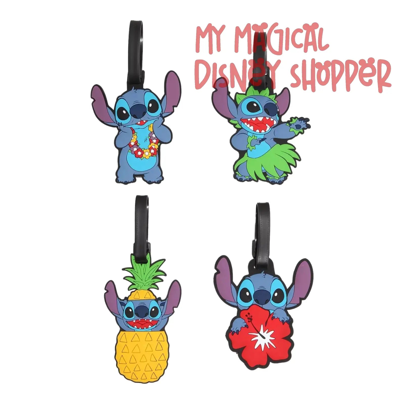 Make sure you're traveling in tropical style. This Lilo & Stitchluggage tag set features designs of your favorite space pup Stitch posing with tropical icons. Comes with a secure plastic buckle and identification paper on the back.