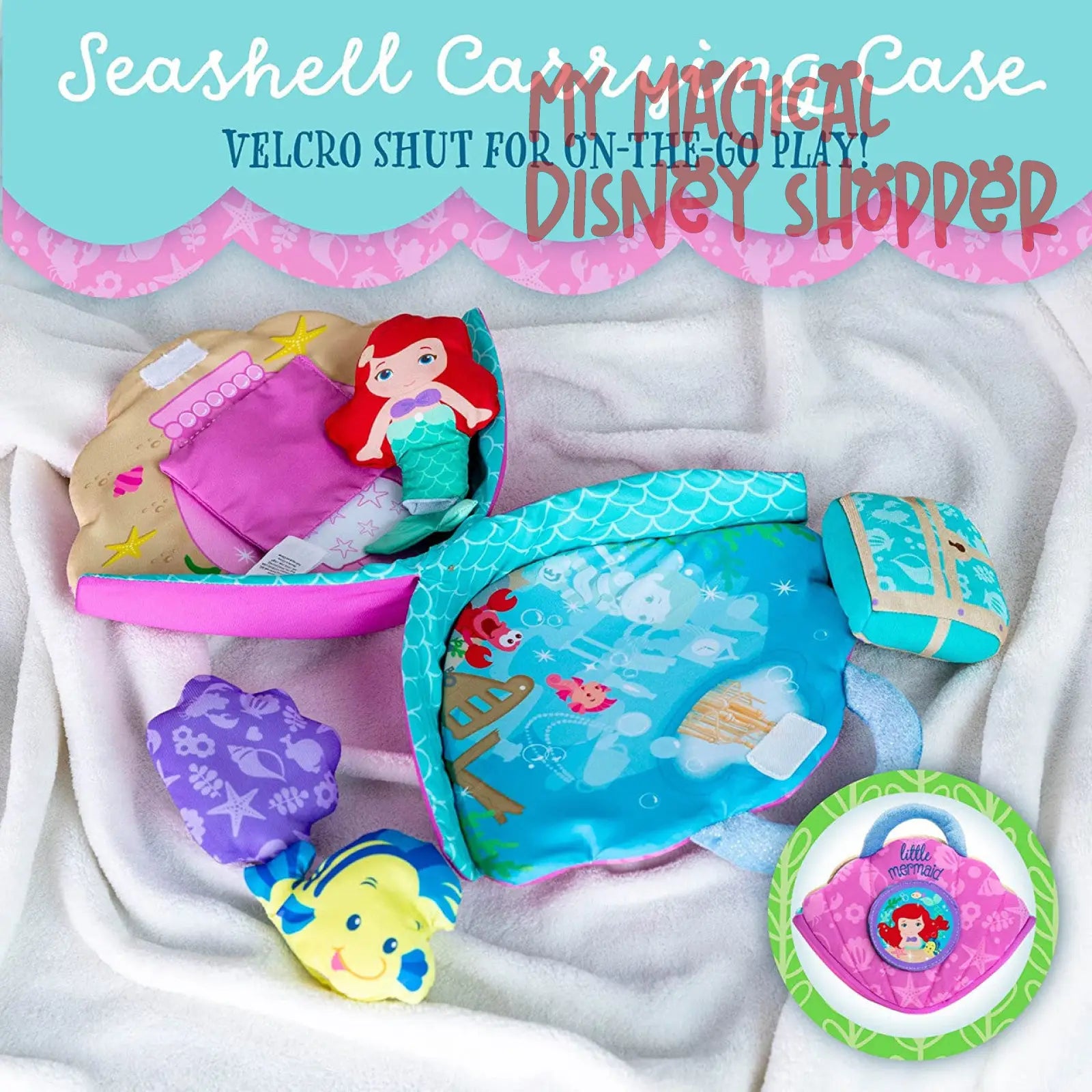 SEASHELL PLAYSET: The seashell carrying case has a peek-a-boo flap with mirror and opens to a play scene and holds a crinkly shell, treasure chest that jingles, & Ariel and Flounder finger puppets.