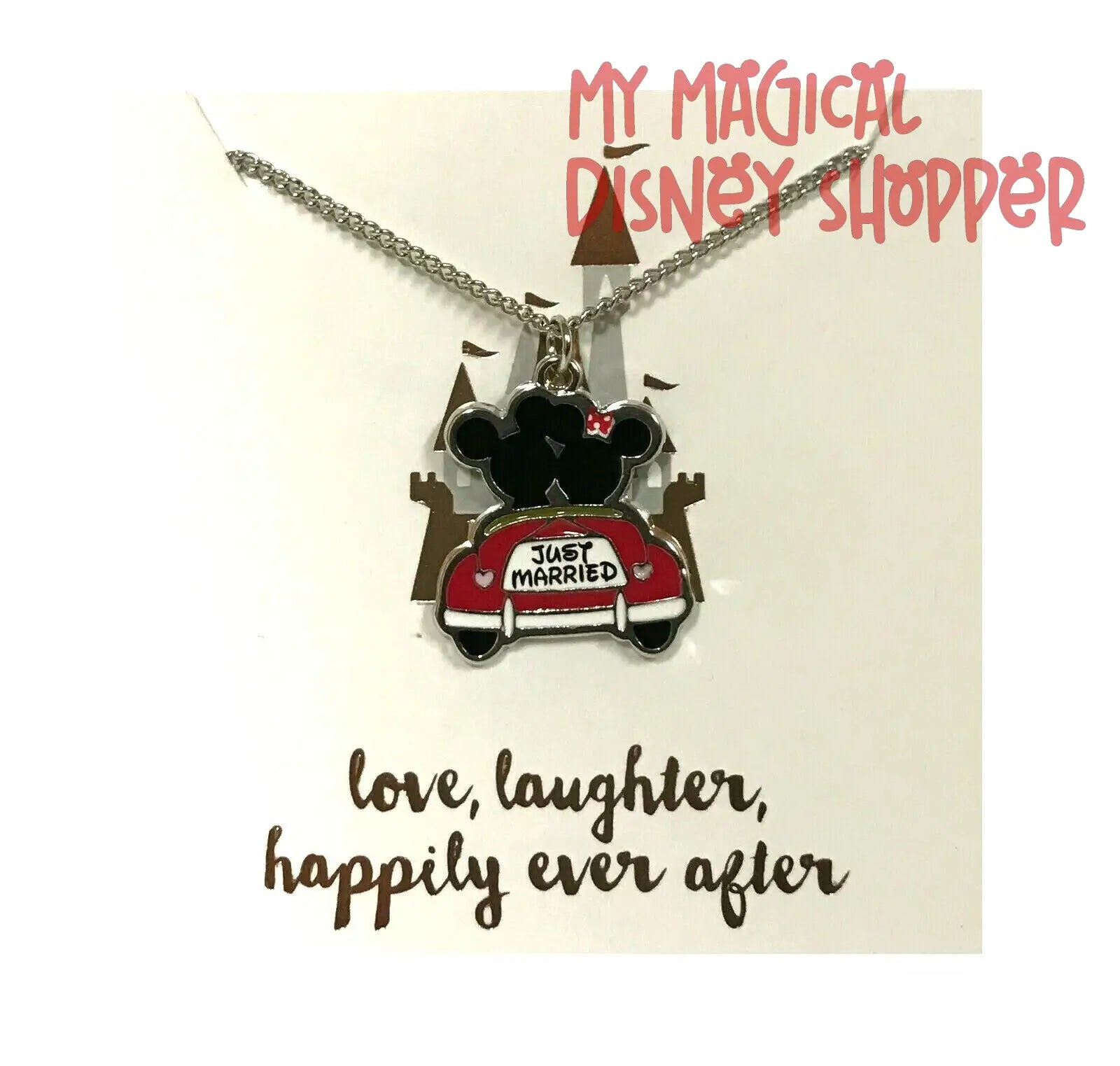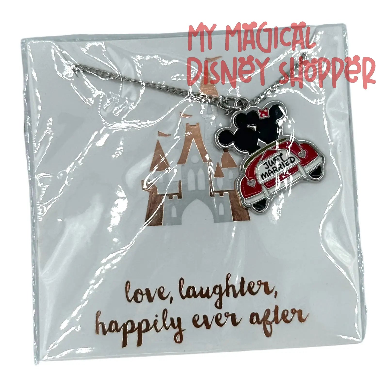 Celebrate your marriage with this adorable charm necklace with Mickey and Minnie driving with a Just Married sign on the back.