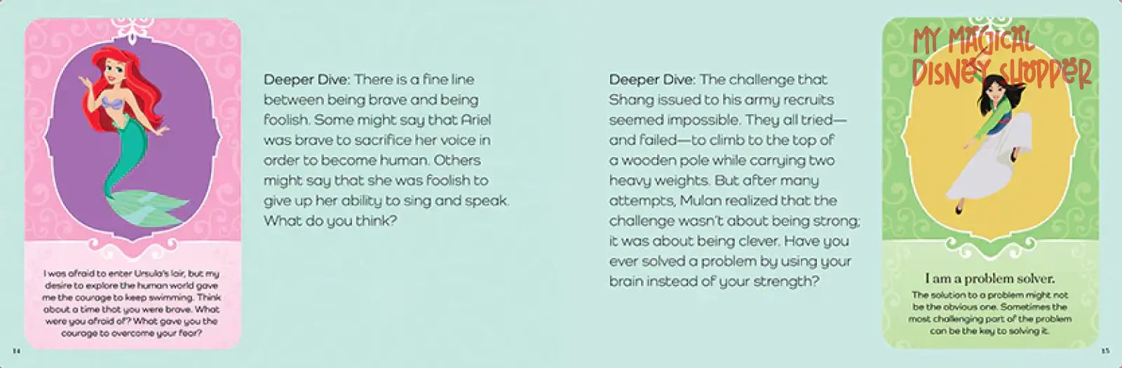 Disney Princesses share advice, inspiration, and positivity in 52 gorgeous motivational cards that celebrate inner beauty and the themes of courage, compassion, and kindness. This uplifting deck highlights key attributes and memorable quotes from the 12 official Disney Princess characters to inspire and delight fans of all ages. Each card will spark meaningful conversations, prompt positive thoughts, help build self-esteem, and encourage girls to be kind to themselves and others.