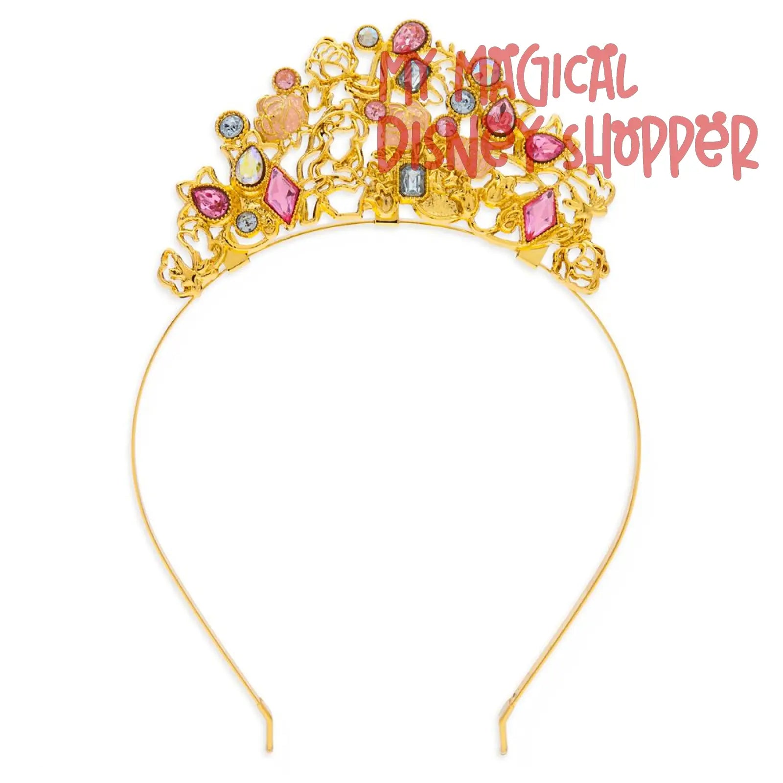 Attend the royal coronation of Princess Aurora as she tops-off her ensemble with this bejeweled golden tiara. Aurora and rose filigree highlight the crowning glory of any Sleeping Beauty costume.