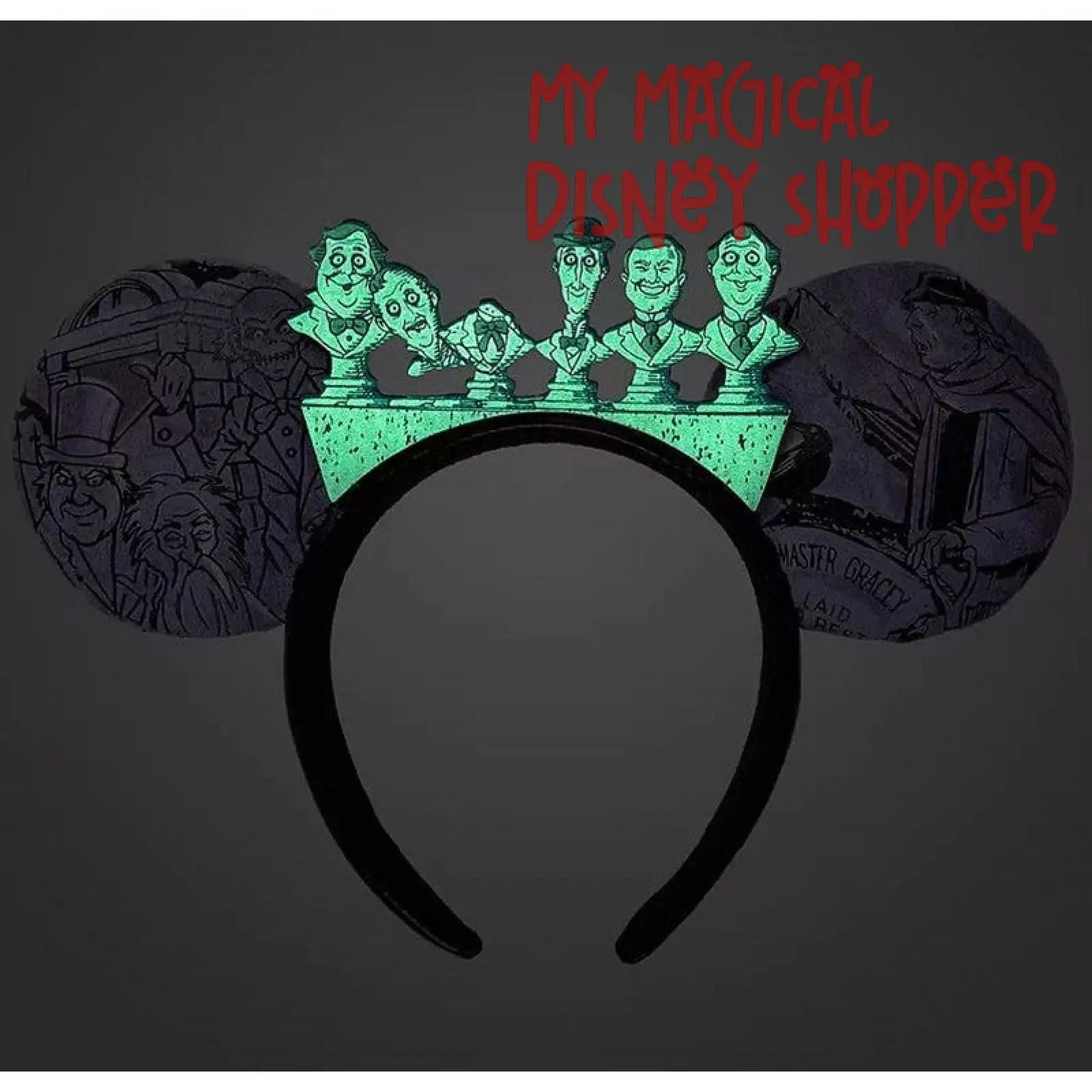 Some of the Grim Grinning Ghosts have come out to socialize! These glow-in-the-dark Graveyard Ear Headband with faux leather band features the singing busts in place of a bow, plus the Hitchhiking Ghosts and Gravedigger on the imitation suede ears.