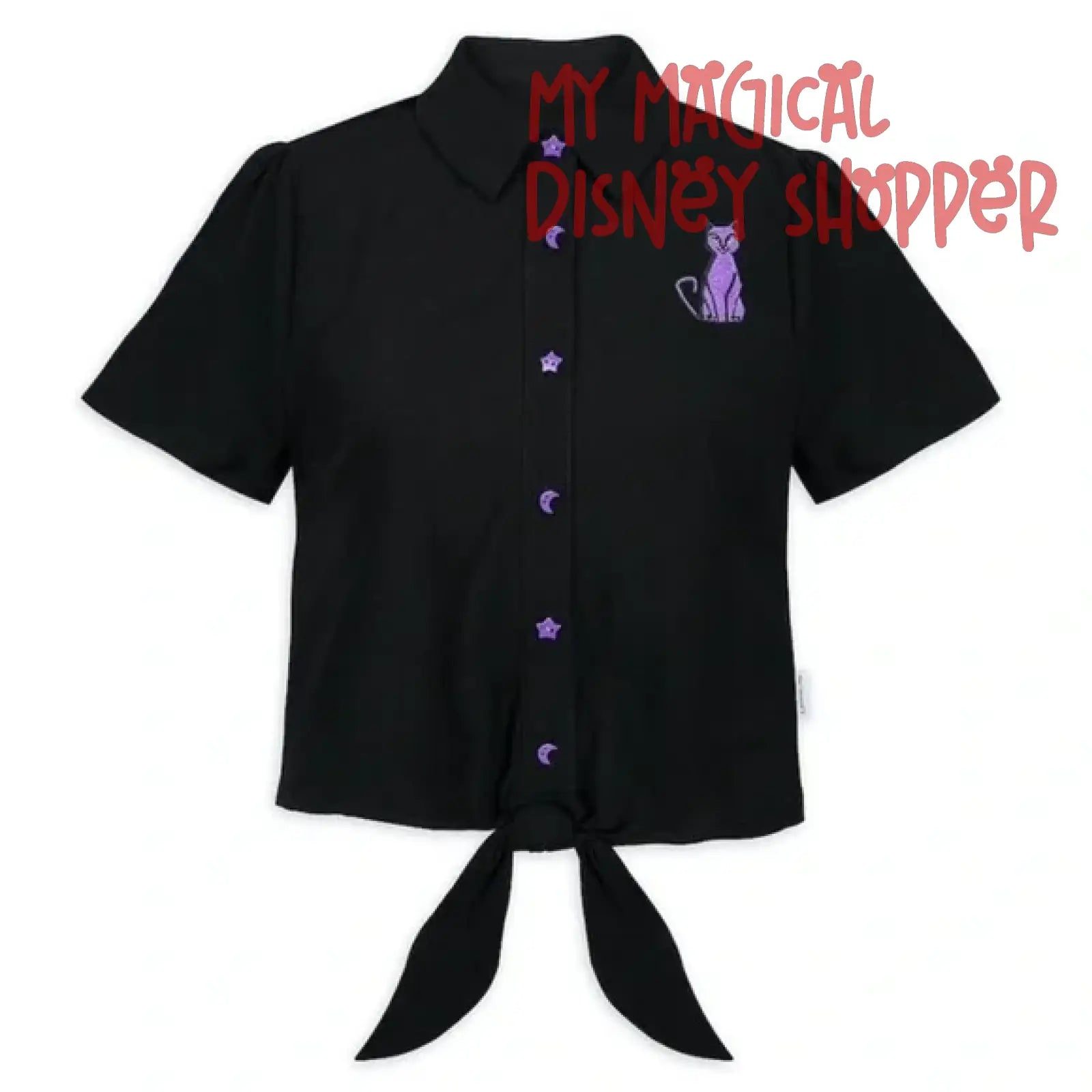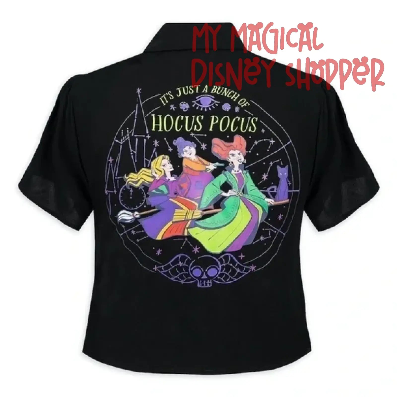 Cast a spell on your wardrobe with this Hocus Pocus Tie Front Shirt from the Disney x Her Universe collection! Featuring the Sanderson Sisters in vibrant colors flying across the back with the phrase “It’s Just a Bunch of Hocus Pocus”, this shirt is the perfect blend of spooky and stylish. The tie-front design and collared short-sleeve cut add a trendy twist, making it a standout piece for Halloween or year-round witchy vibes.