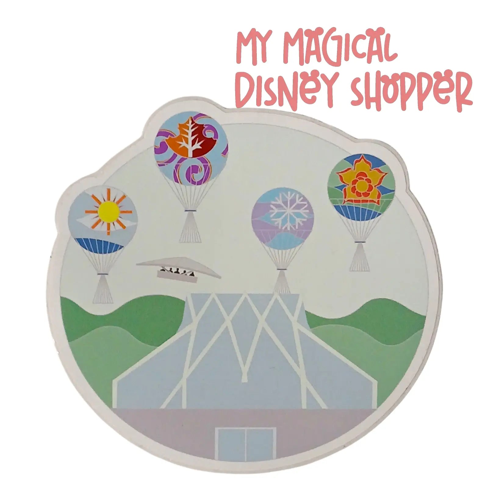 Featuring a whimsical design of hot air balloons representing the seasons, rolling green landscapes, and The Land Pavilion below, this approx. 3” x 3.5” sticker captures the heart of EPCOT’s spirit — innovation, nature, and a touch of Disney wonder.