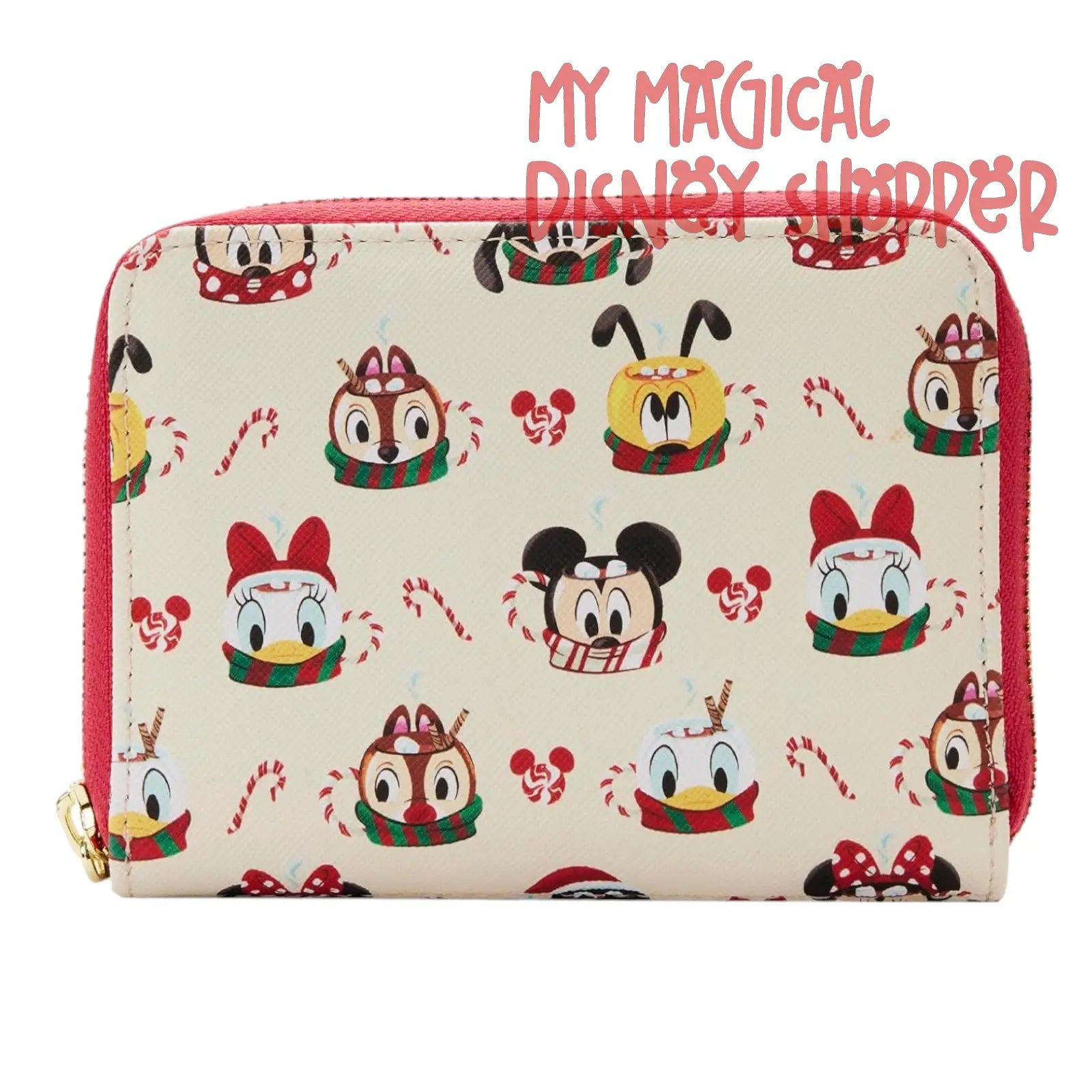 Share in a holiday toast with this Loungefly Disney hot cocoa mugs zipper wallet. This wallet features a festive print of cherished Disney characters as holiday mugs. You’ll certainly be able to spot Mickey Mouse and Minnie Mouse’s ears sticking up over mugs of cocoa, but you’ll also find Pluto, Goofy, Donald Duck and Daisy Duck. Inside, there are 4 slots for holding cards and 1 clear slot for holding your ID. A die-cut shape of Mickey Mouse ears adds a classic Disney touch. It’s the perfect accessory for dashing about on holiday errands—or for visiting your favorite holiday-themed events.