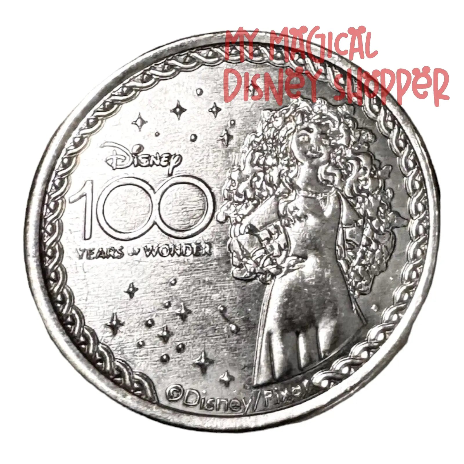 Introducing the Disney 100th Anniversary Silver-Colored Medallion, a shimmering tribute to a century of enchanting ice-bound adventures and cherished friendships. Gleaming in a lustrous silver finish, this limited-edition piece showcases the beloved Merida from Brave, capturing her magical journeys on one side. On the reverse, the distinguished "100 Years of Wonder" Walt Disney World logo takes center stage, symbolizing a century of cherished stories and unforgettable moments.