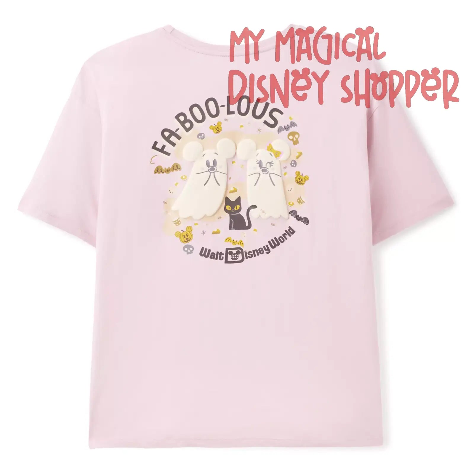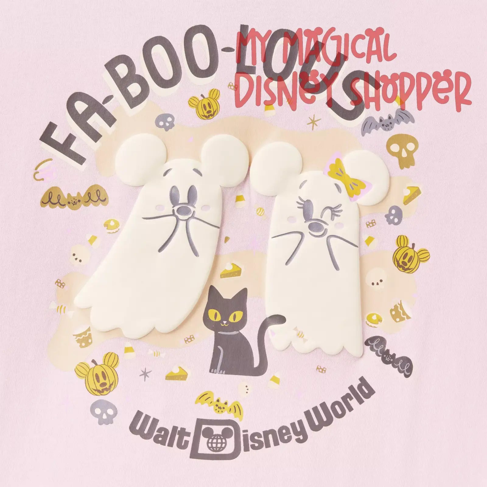 - Back features Halloween design with puff ink Cutie Ghosts Mickey and Minnie, ''Fa-boo-lous'', ''Walt Disney World'' plus black cat, pumpkins, bats and candy