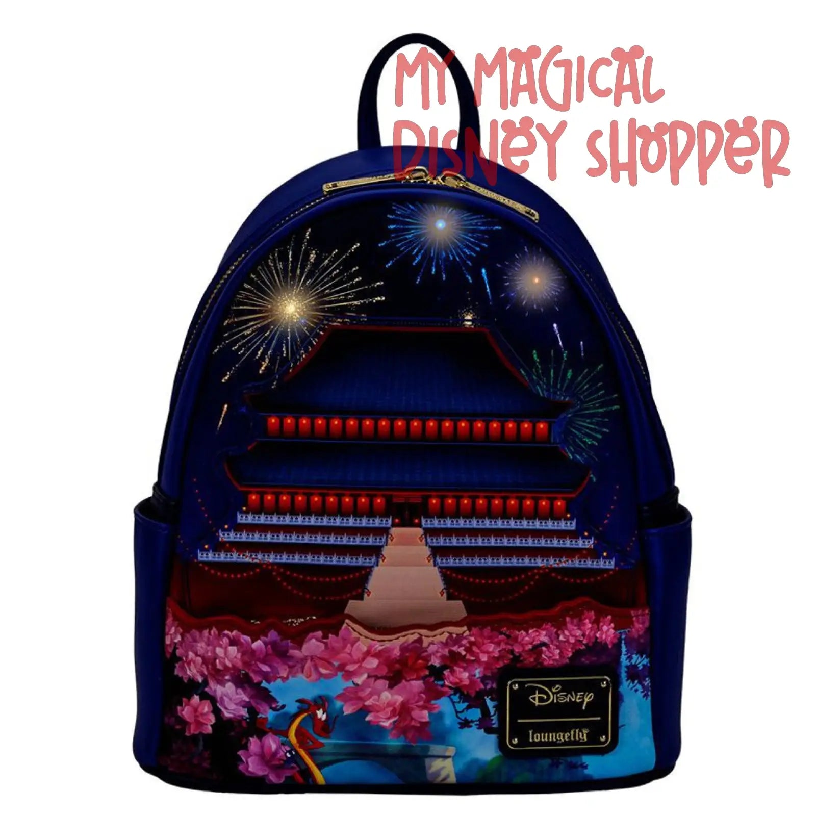 Castle Light Up Mini Backpack. On the front, the palace is lit up by fireworks and framed by pink blossoms. In fact, the flower scene