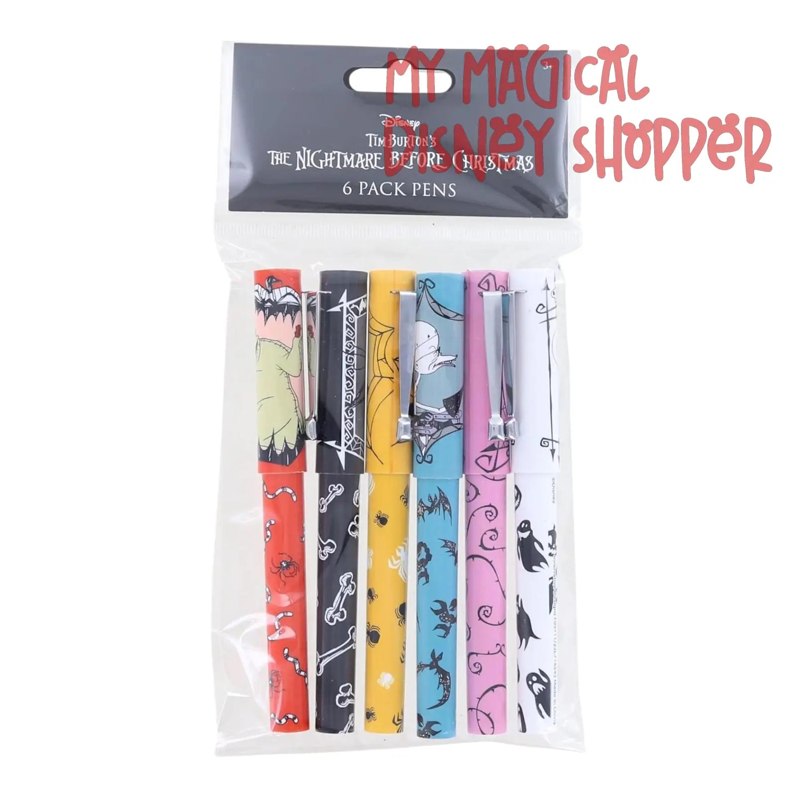 This colorful pen set features your favorite Nightmare Before Christmas characters! This stationary set comes with six (6) black ink pens.