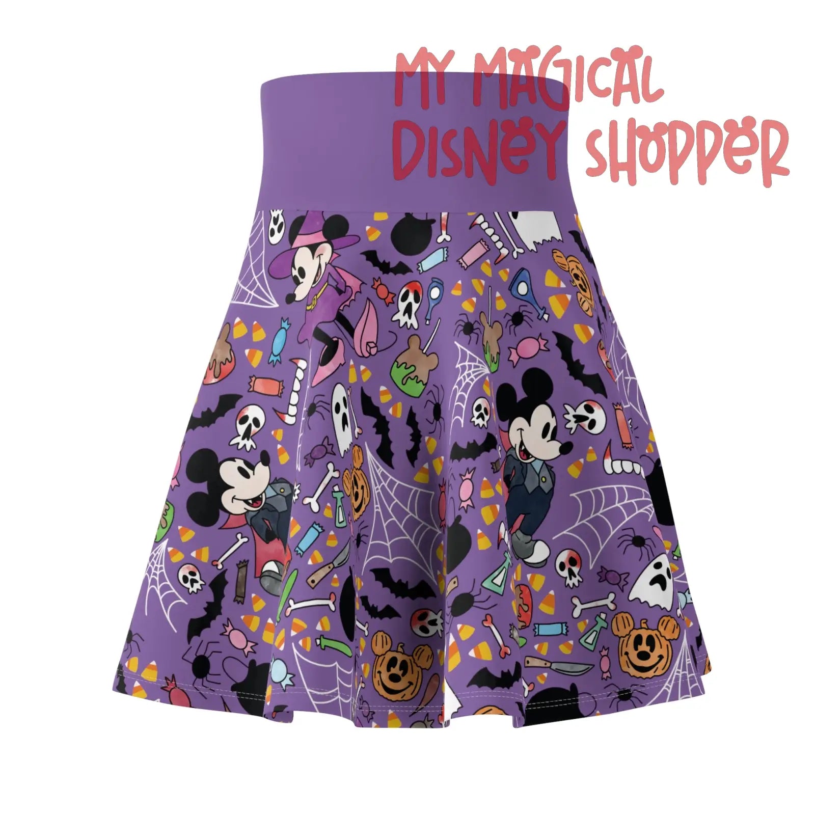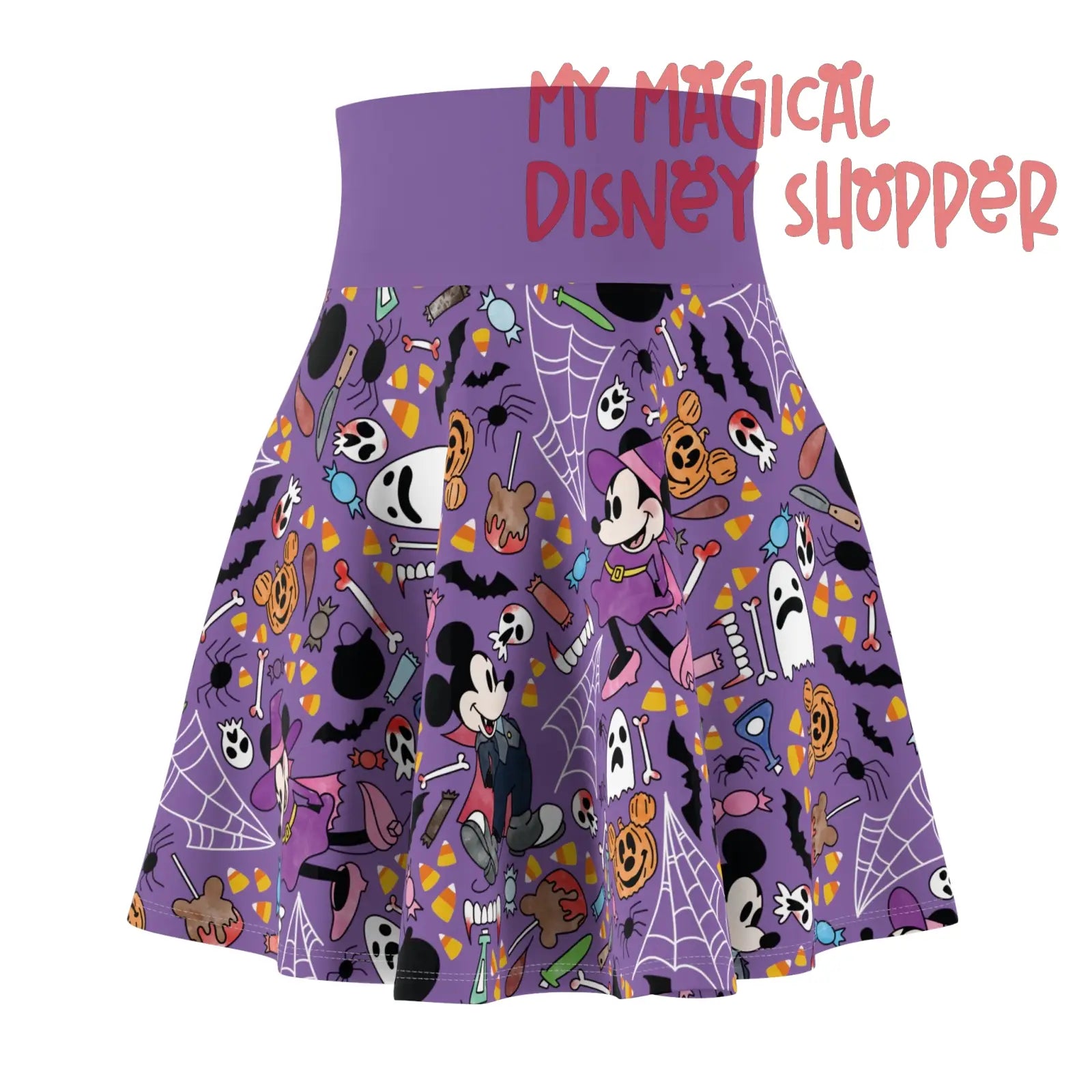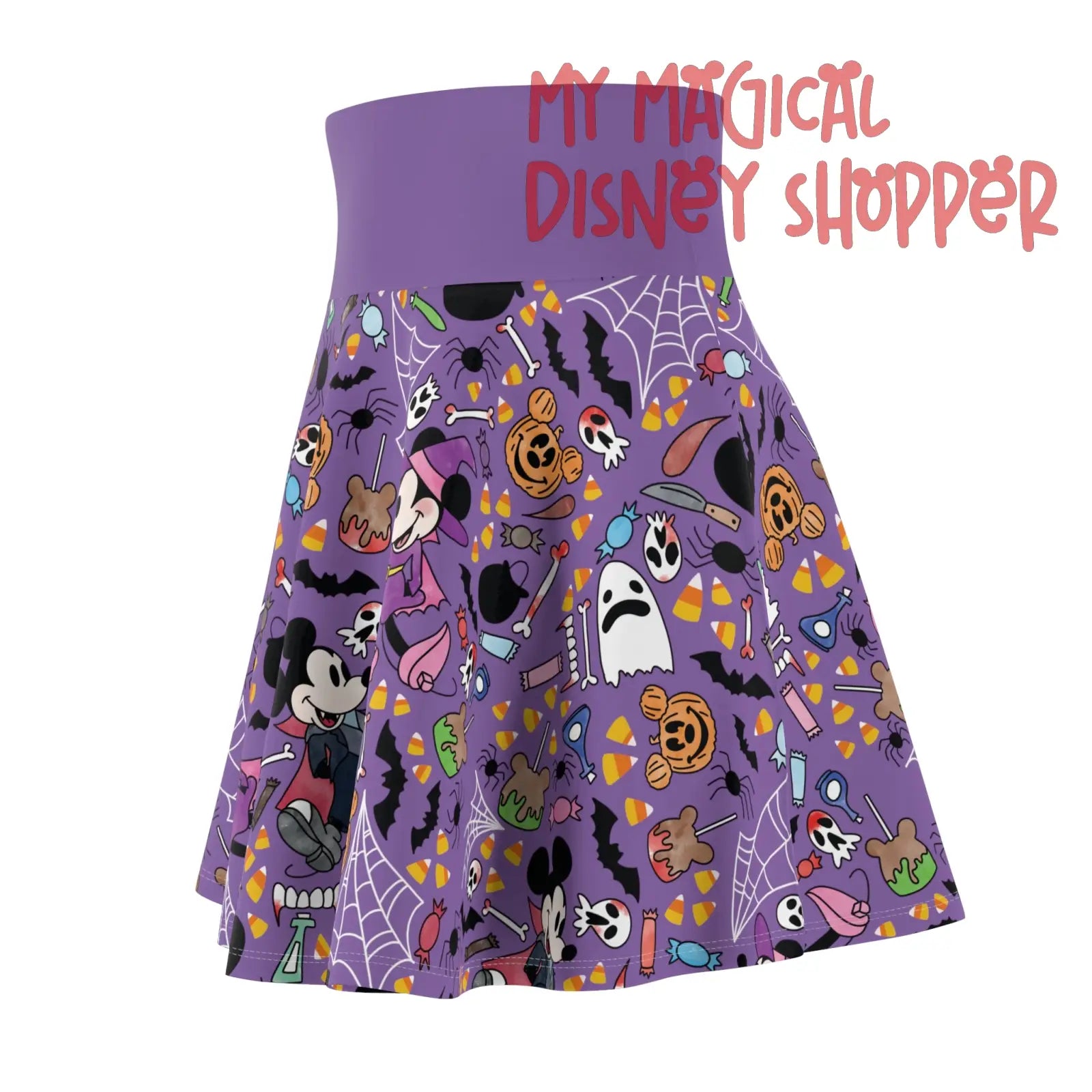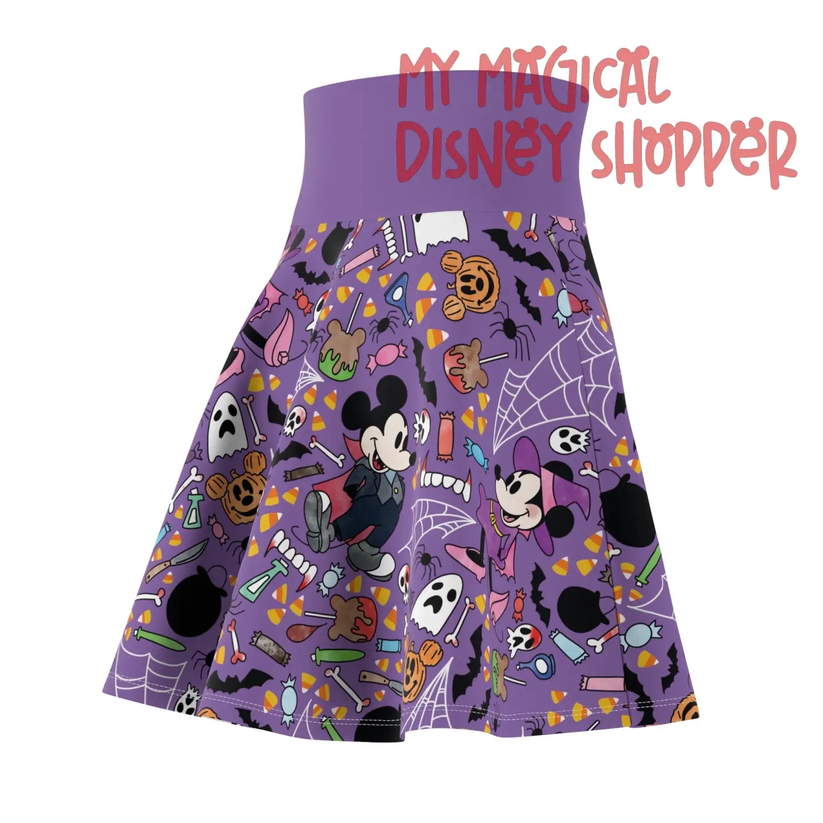 Our "Not So Scary Women's Skater Skirt" in enchanting purple is a playful and versatile fashion choice. This whimsical skirt features a flattering A-line silhouette, perfect for any occasion. Its vibrant hue adds a pop of color to your wardrobe, making it a chic and fun statement piece, adorned with charming Mickey and Minnie motifs for a touch of magic.
