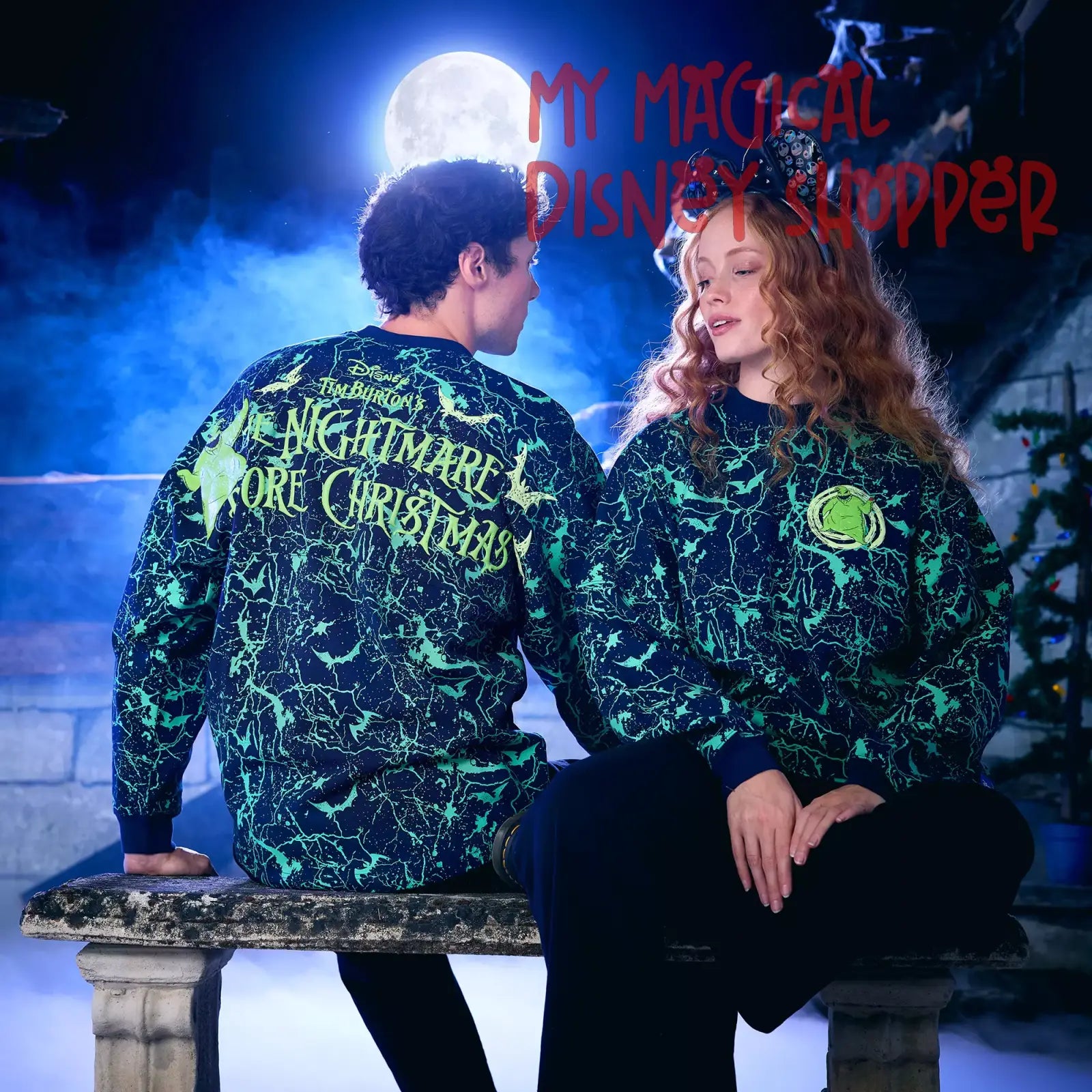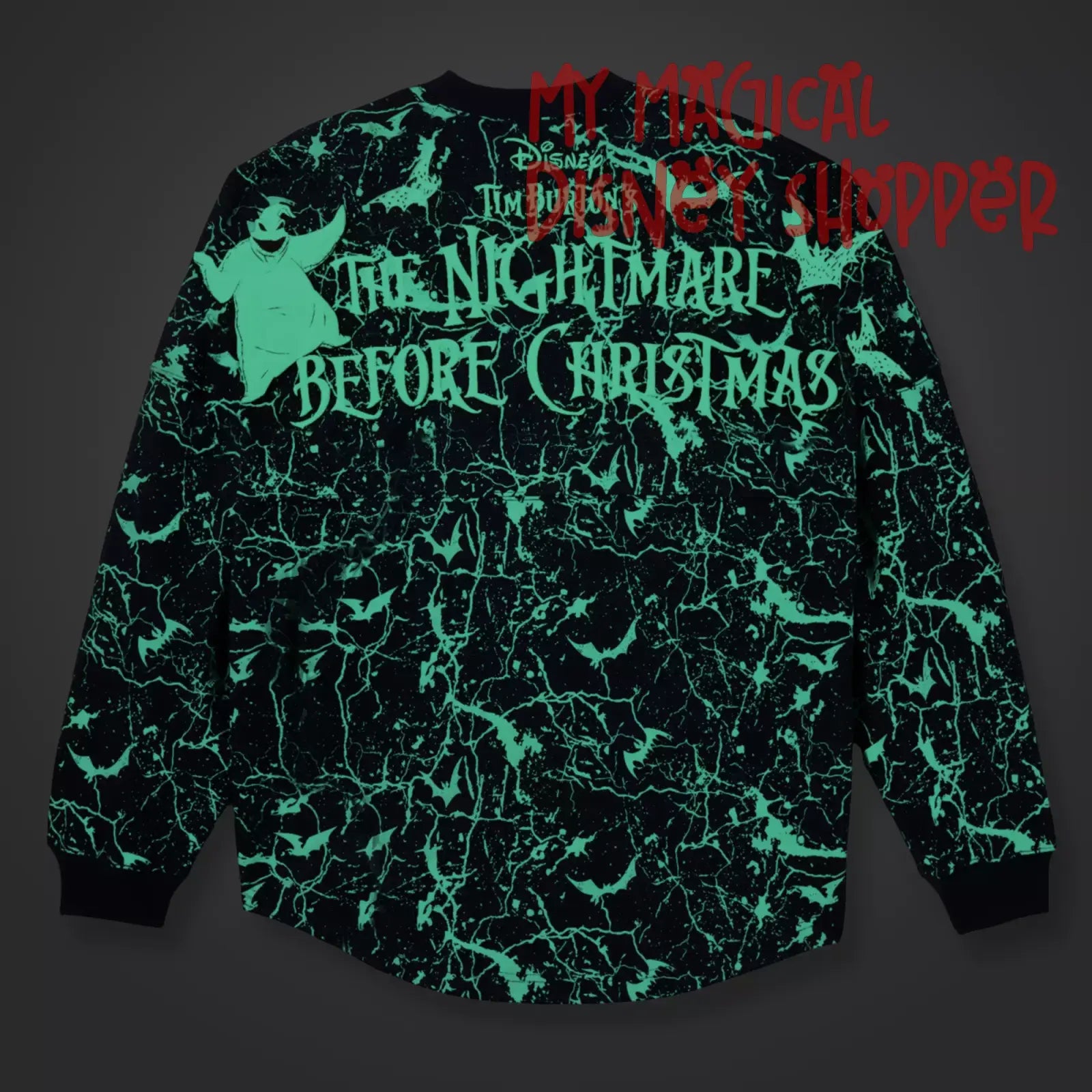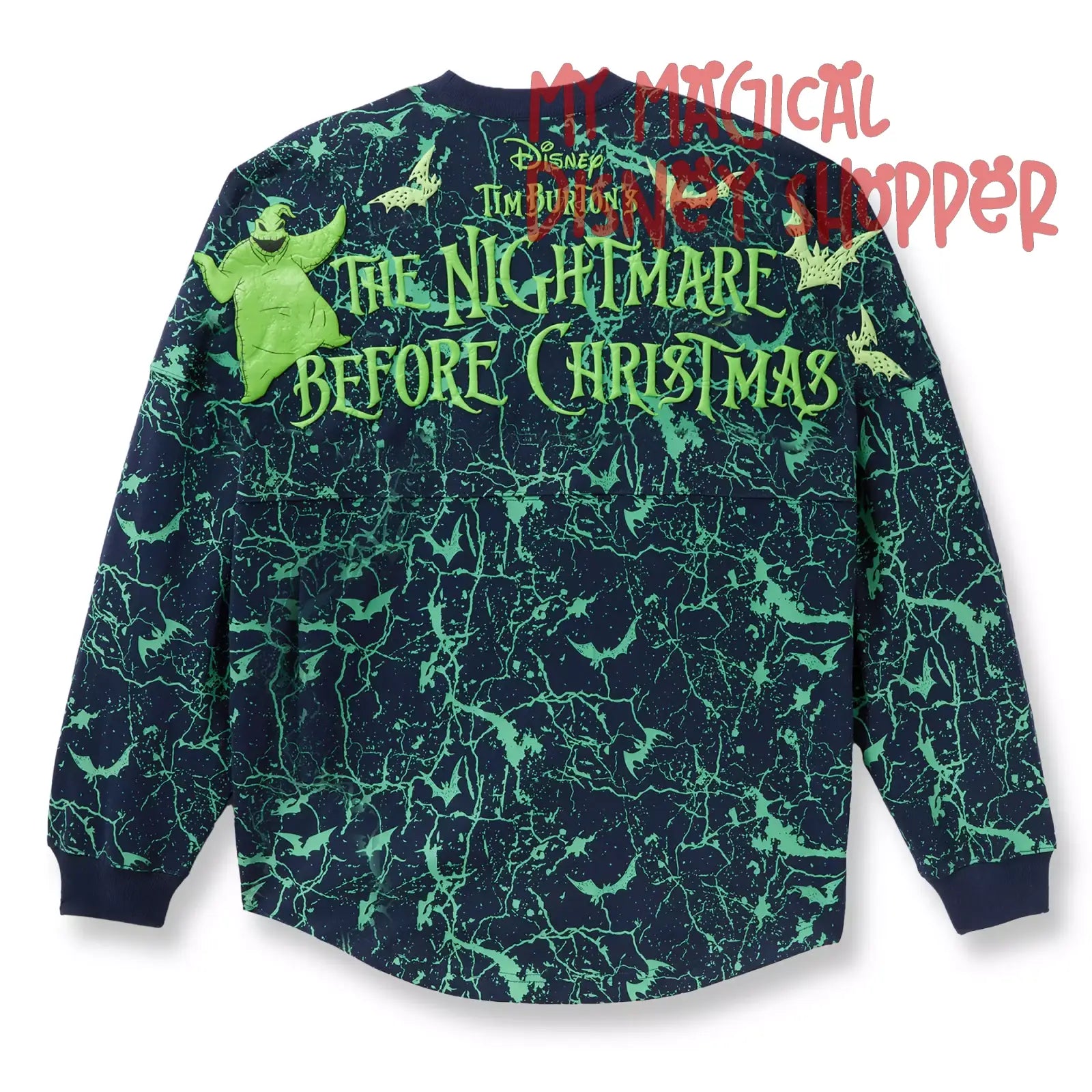 - Puffy ink Tim Burton's The Nightmare Before Christmas logo on back shoulder, with bats and Oogie Boogie