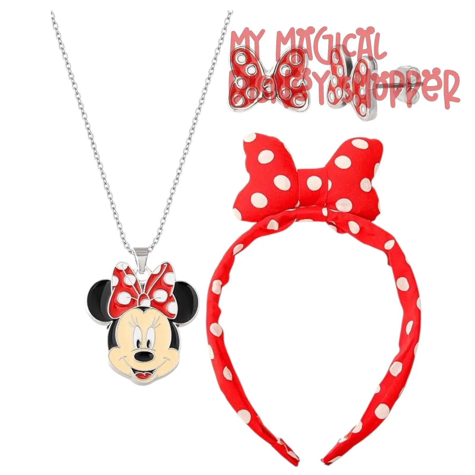 Complementing the earrings is a vibrant Minnie Mouse pendant necklace, measuring 16 inches with an additional 3 inches for adjustable length, secured by a lobster clasp closure.