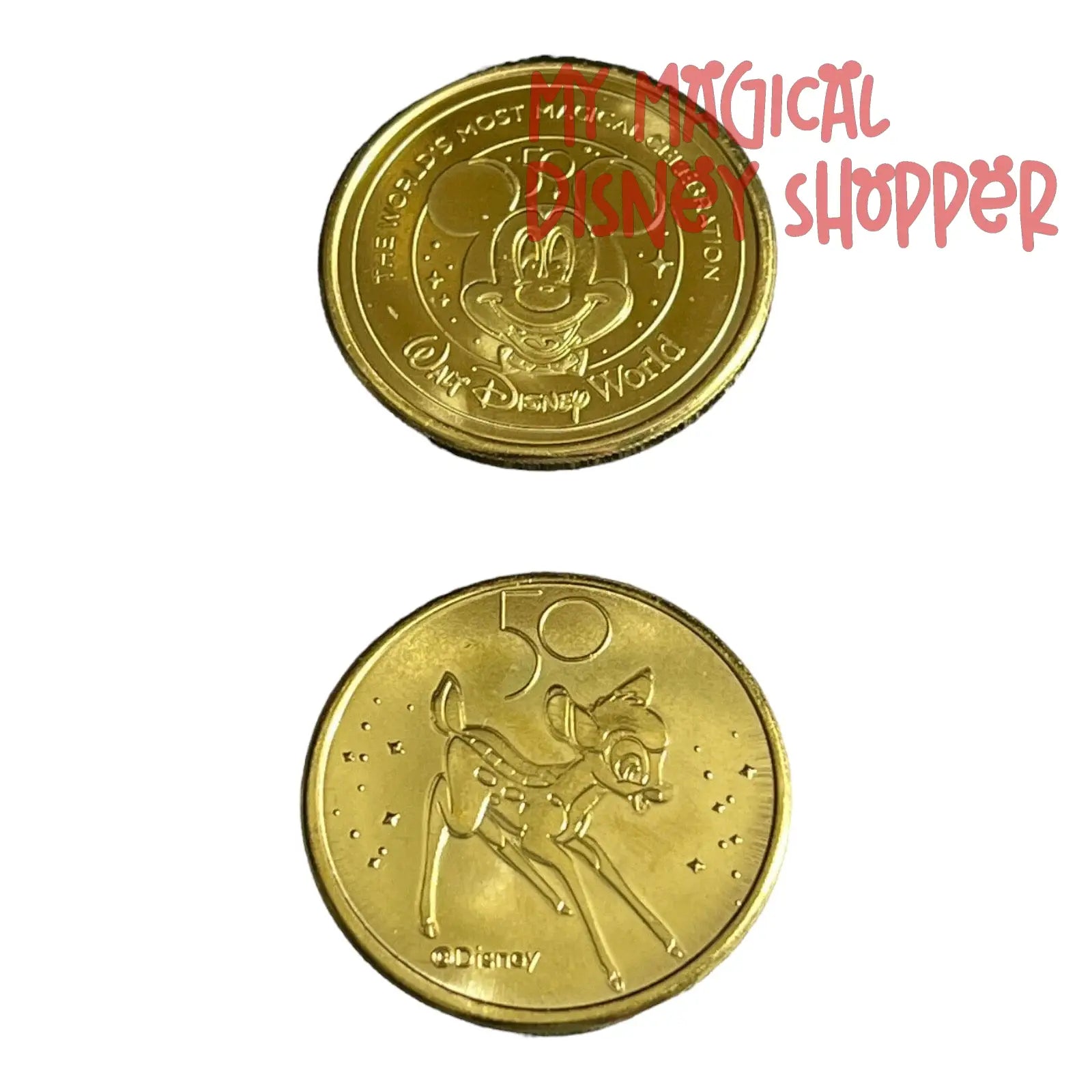 Celebrate the enchanting legacy of Walt Disney World's 50th Anniversary with this exquisite gold-colored medallion. Featuring the beloved Bambi on one side, intricately designed against a radiant gold backdrop, this limited-edition keepsake captures the innocence and magic of Disney. Flip it over to discover the iconic Mickey Mouse, surrounded by the festive proclamation "The World's Most Magical Celebration" and adorned with the Walt Disney World logo on the reverse. Meticulously crafted, this medallion pays homage to five decades of joy and wonder, making it a cherished addition for Disney enthusiasts and collectors alike. Relive the magic and embrace the spirit of Walt Disney World's enduring legacy with this finely detailed and iconic piece.