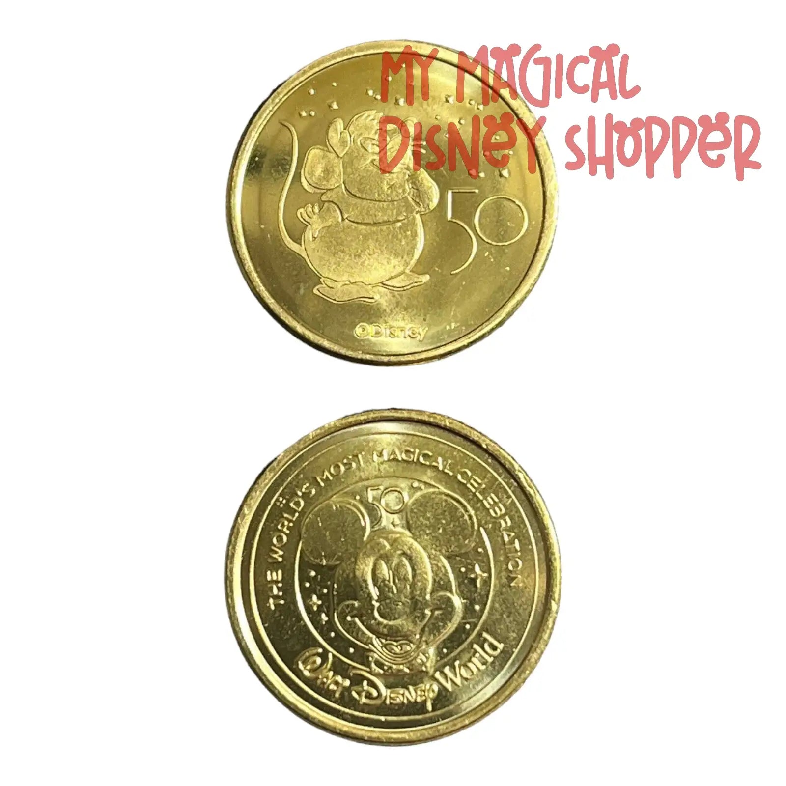 Celebrate Walt Disney World's 50th Anniversary with this charming gold-colored medallion featuring the endearing GusGus on one side, portrayed against a radiant gold backdrop. This limited-edition keepsake captures the whimsical charm of Disney's iconic character from Cinderella. Flip it over to discover the iconic Mickey Mouse, surrounded by the joyous proclamation "The World's Most Magical Celebration" and adorned with the Walt Disney World logo on the reverse. Meticulously crafted, this medallion pays homage to five decades of magic, making it a treasured addition for Disney enthusiasts and collectors alike. Embrace the enchantment and relive the spirit of Walt Disney World's enduring legacy with this finely detailed and iconic piece.