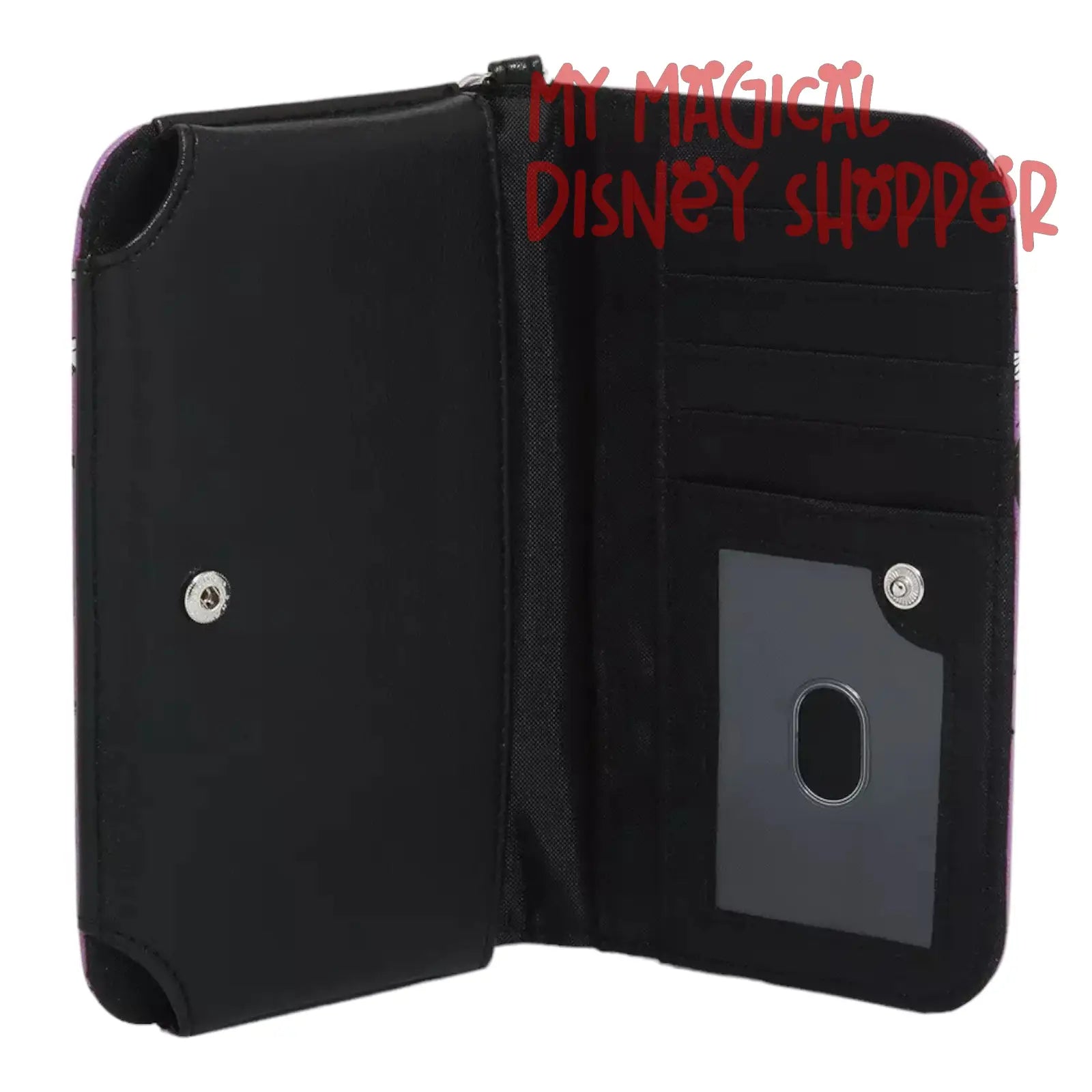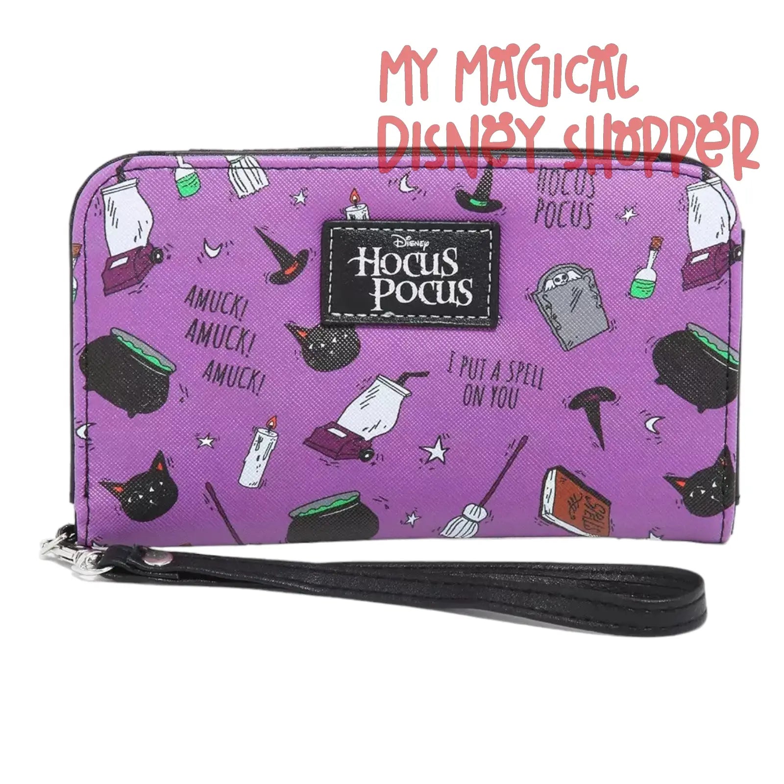 Heading out to defeat the Sanderson Sisters with Max and his crew? You'll need to travel light! This tech wallet has an allover print of Hocus Pocus icons, from Mary's vacuum to Binx. Features two billfolds, 4 card slots and clear ID display with a zipper pocket on the outside. There is also a snap-button closure and a detachable wrist strap.