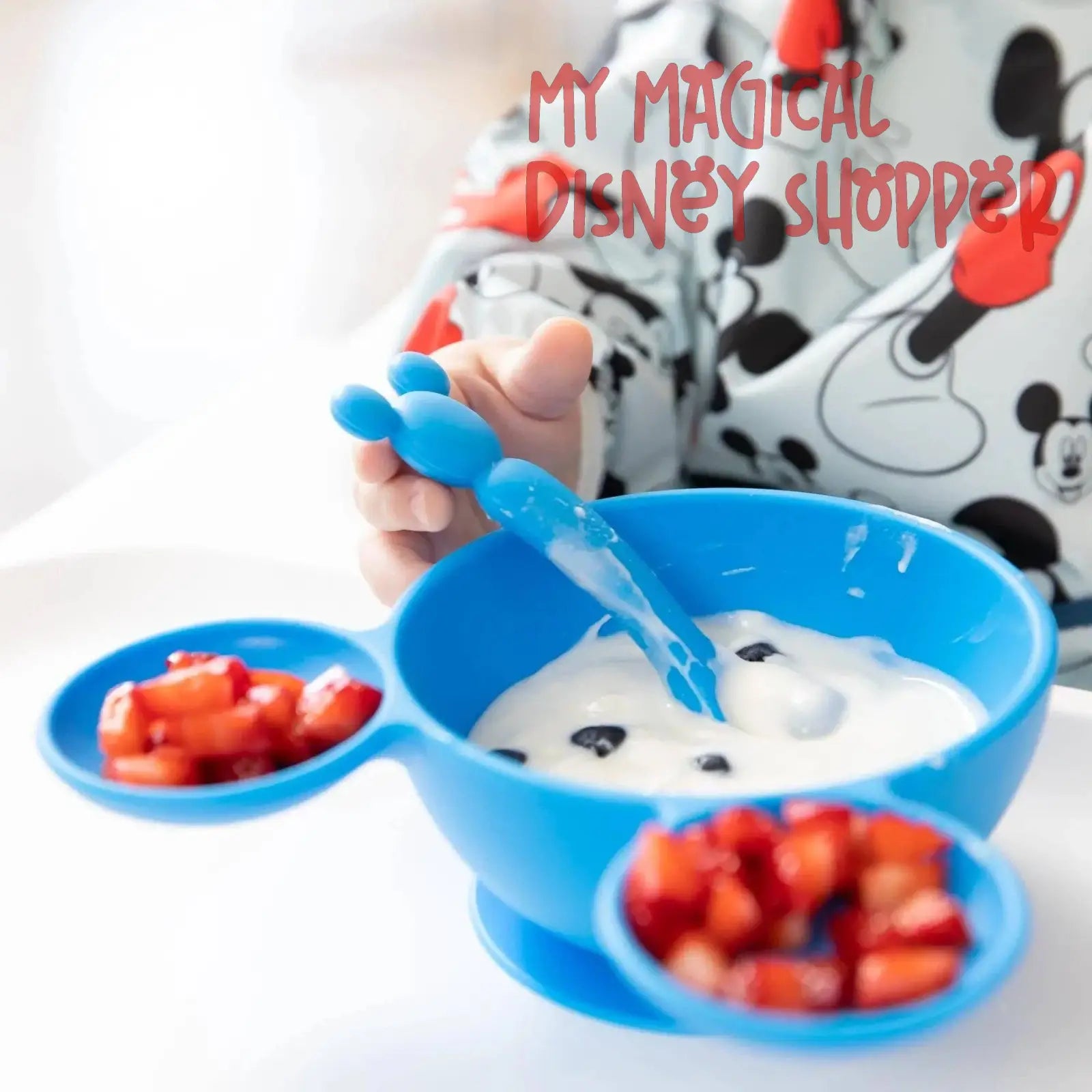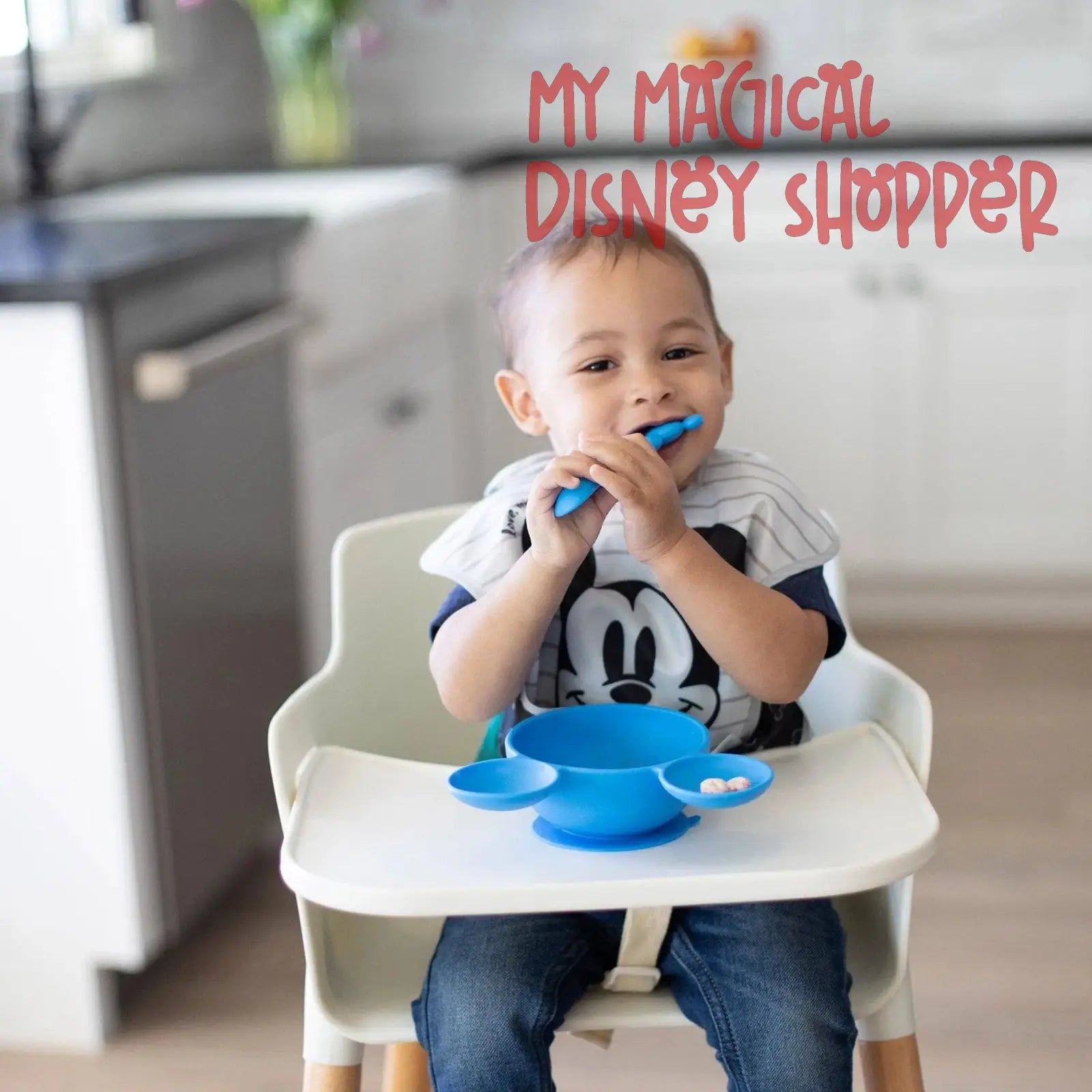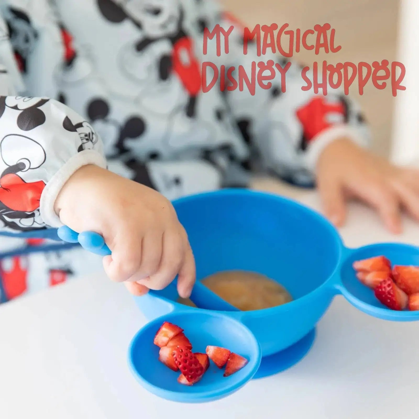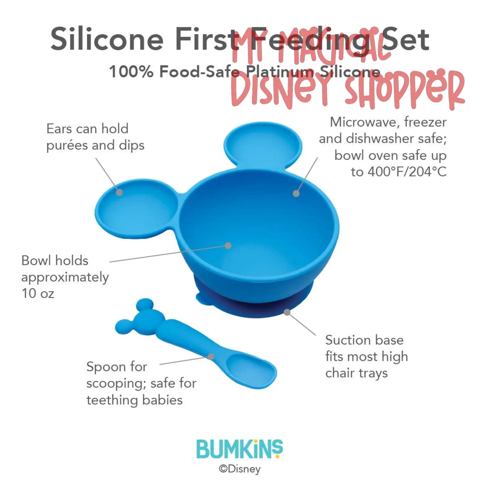 Our Mickey Mouse Silicone First Feeding Set helps you to transition your baby to self-feeding and introduce solid foods. The suction base keeps the bowl from sliding or flipping over. Great for use on highchair trays or tables. Made with 100% food-safe silicone, the spoon is soft and safe for teething babies.