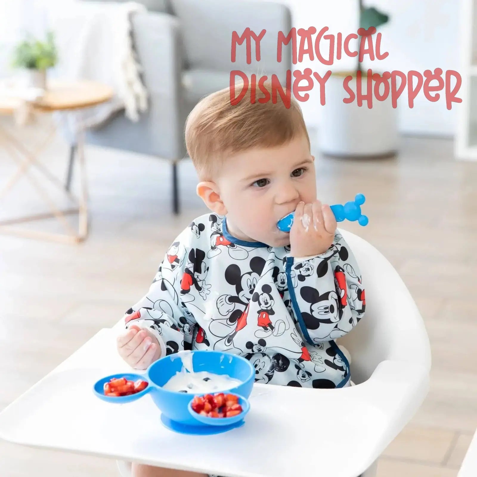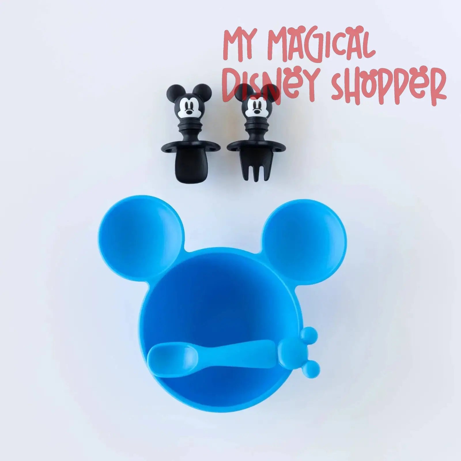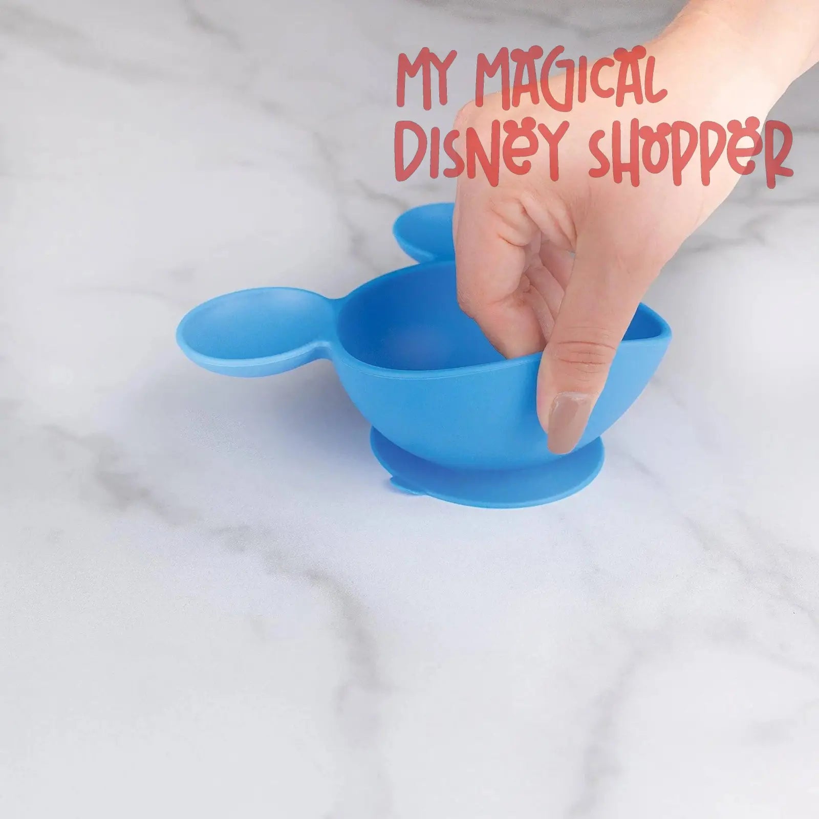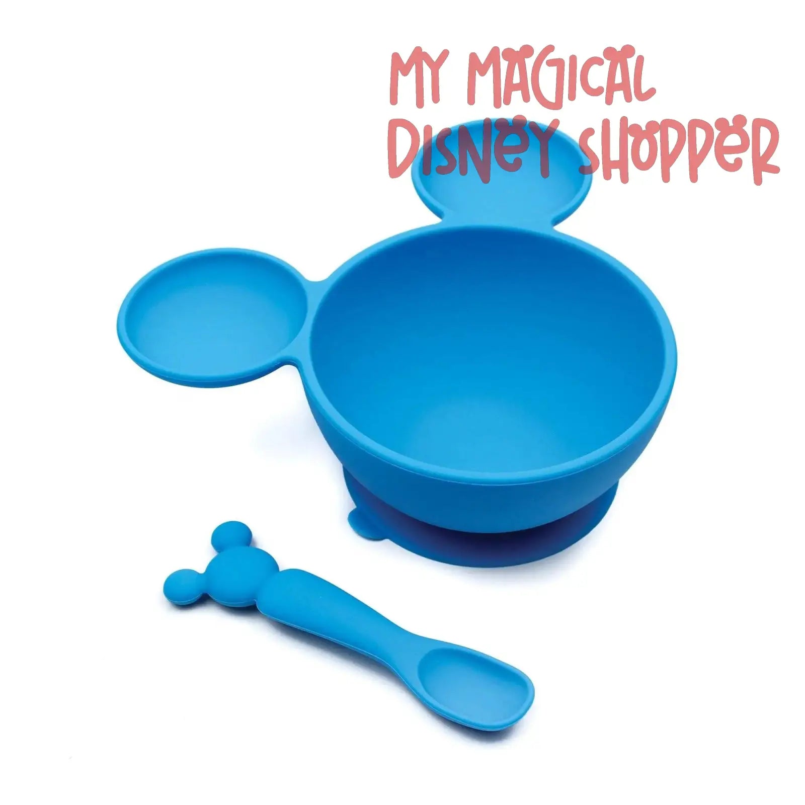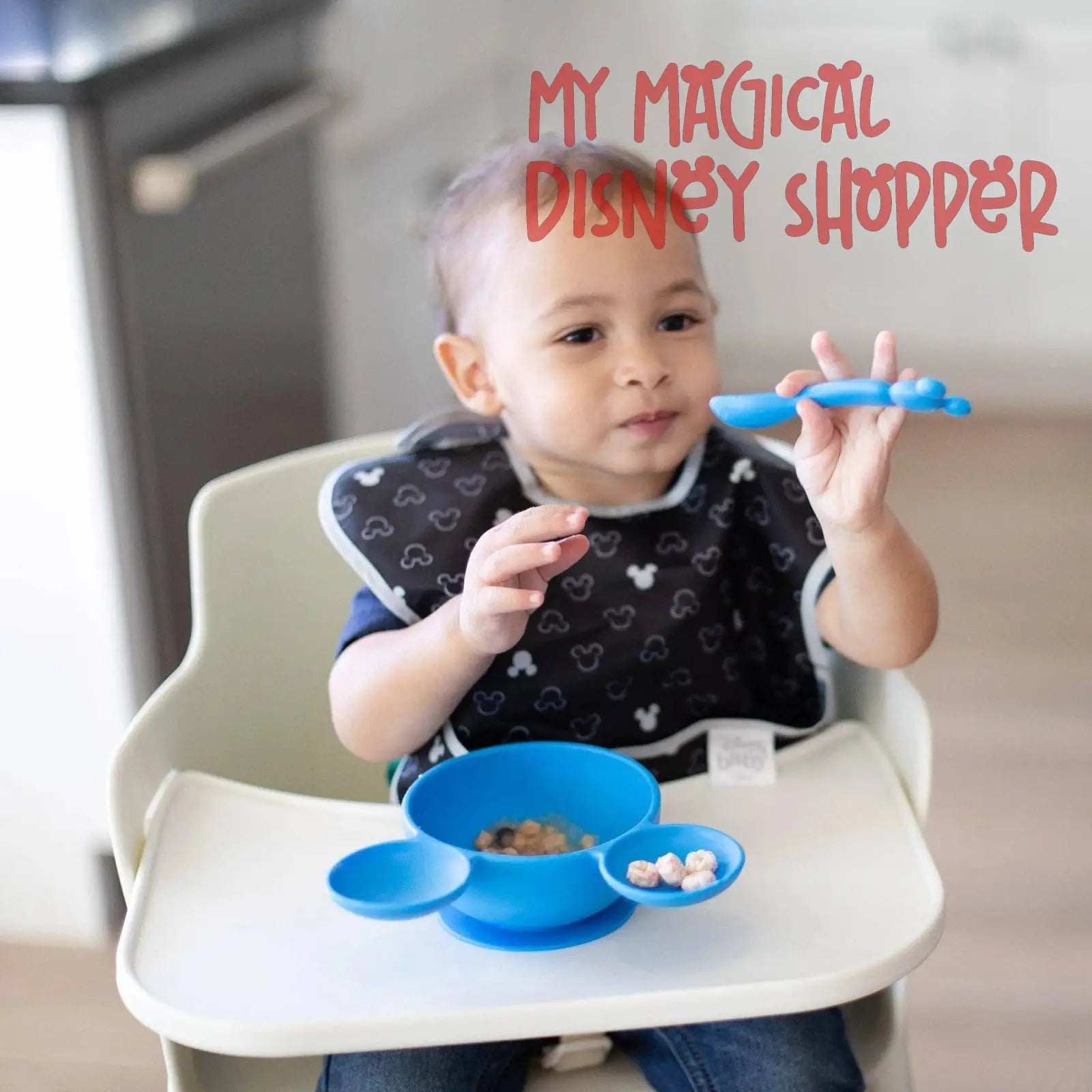 Our Mickey Mouse Silicone First Feeding Set helps you to transition your baby to self-feeding and introduce solid foods. The suction base keeps the bowl from sliding or flipping over. Great for use on highchair trays or tables. Made with 100% food-safe silicone, the spoon is soft and safe for teething babies.