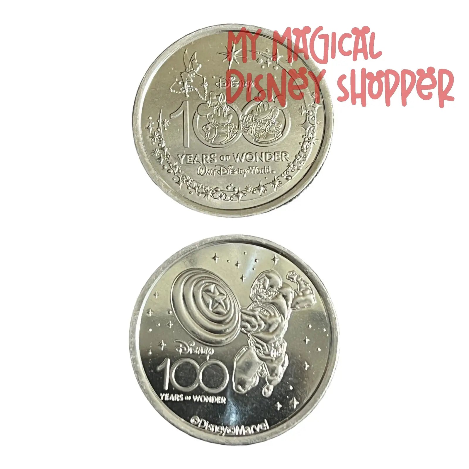 Introducing the Disney 100th Anniversary Silver-Colored Medallion, a heroic tribute to a century of courage, patriotism, and unwavering resolve. Gleaming in a radiant silver finish, this limited-edition piece showcases the iconic Captain America, capturing his indomitable spirit and dedication to justice on one side. On the reverse, the distinguished "100 Years of Wonder" Walt Disney World logo takes center stage, symbolizing a century of cherished stories and unforgettable moments.