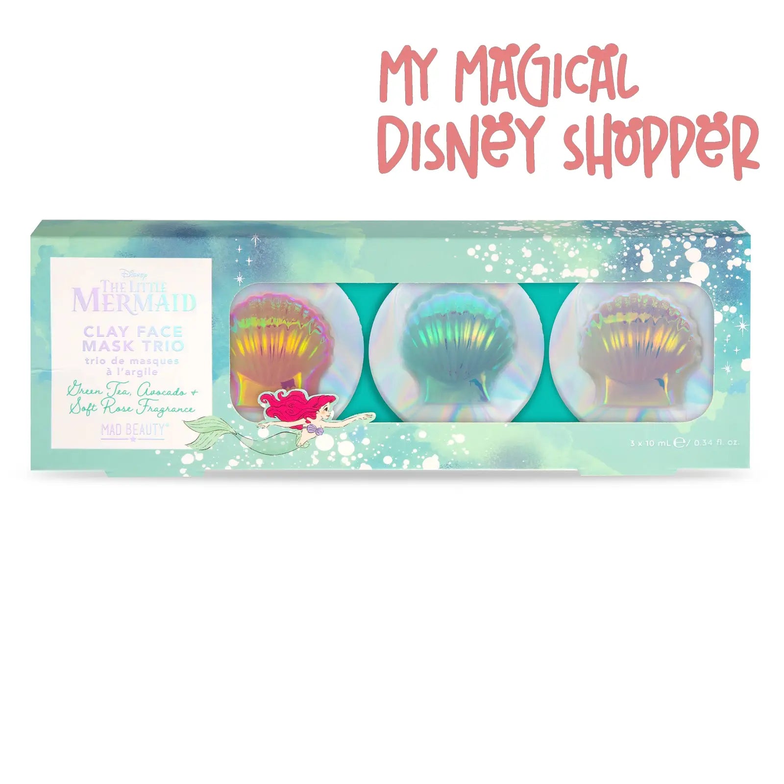 INCLUDES: 3 Disney The Little Mermaid Clay Face Mask Pods (each 0.34 fl. oz.). This product has not been tested on animals.