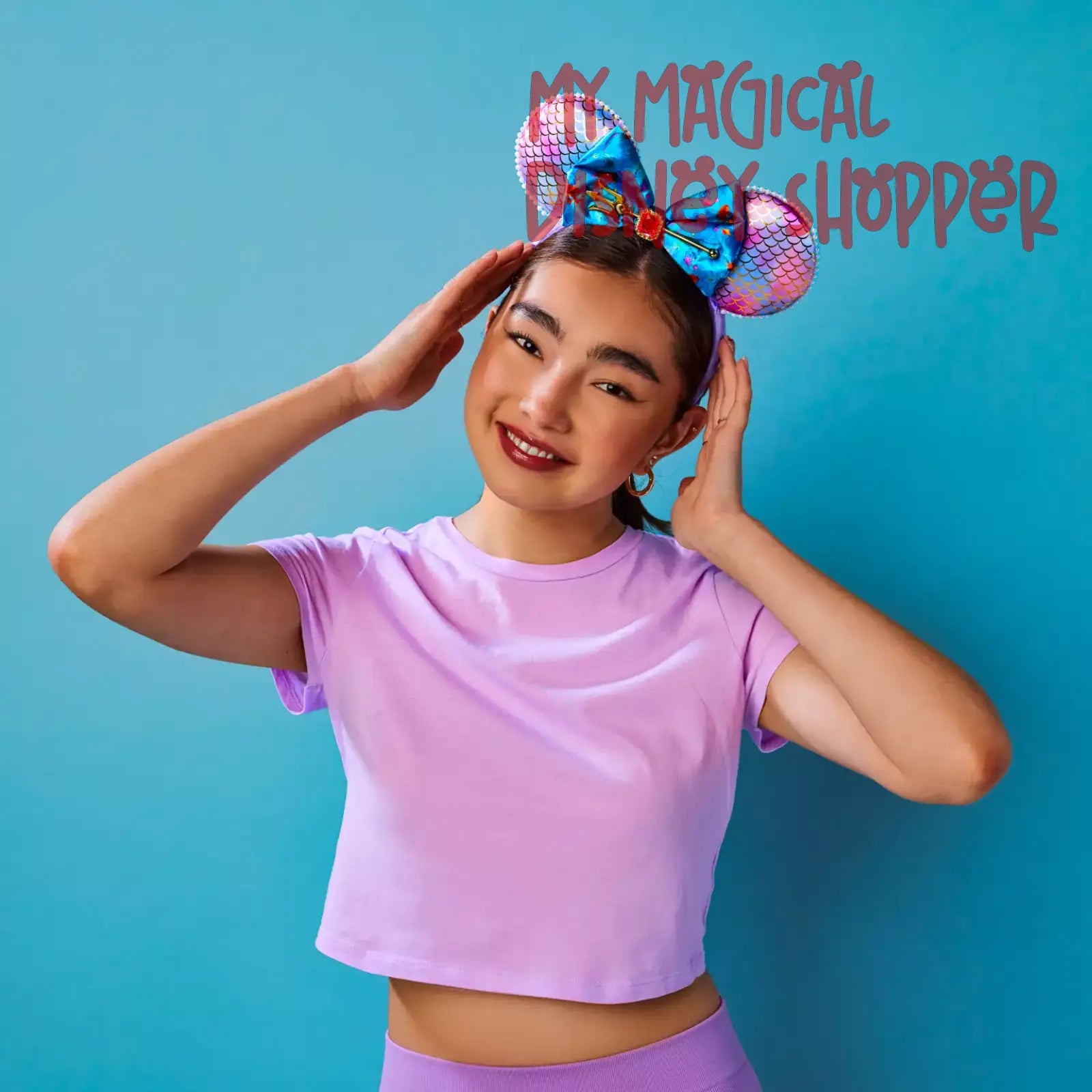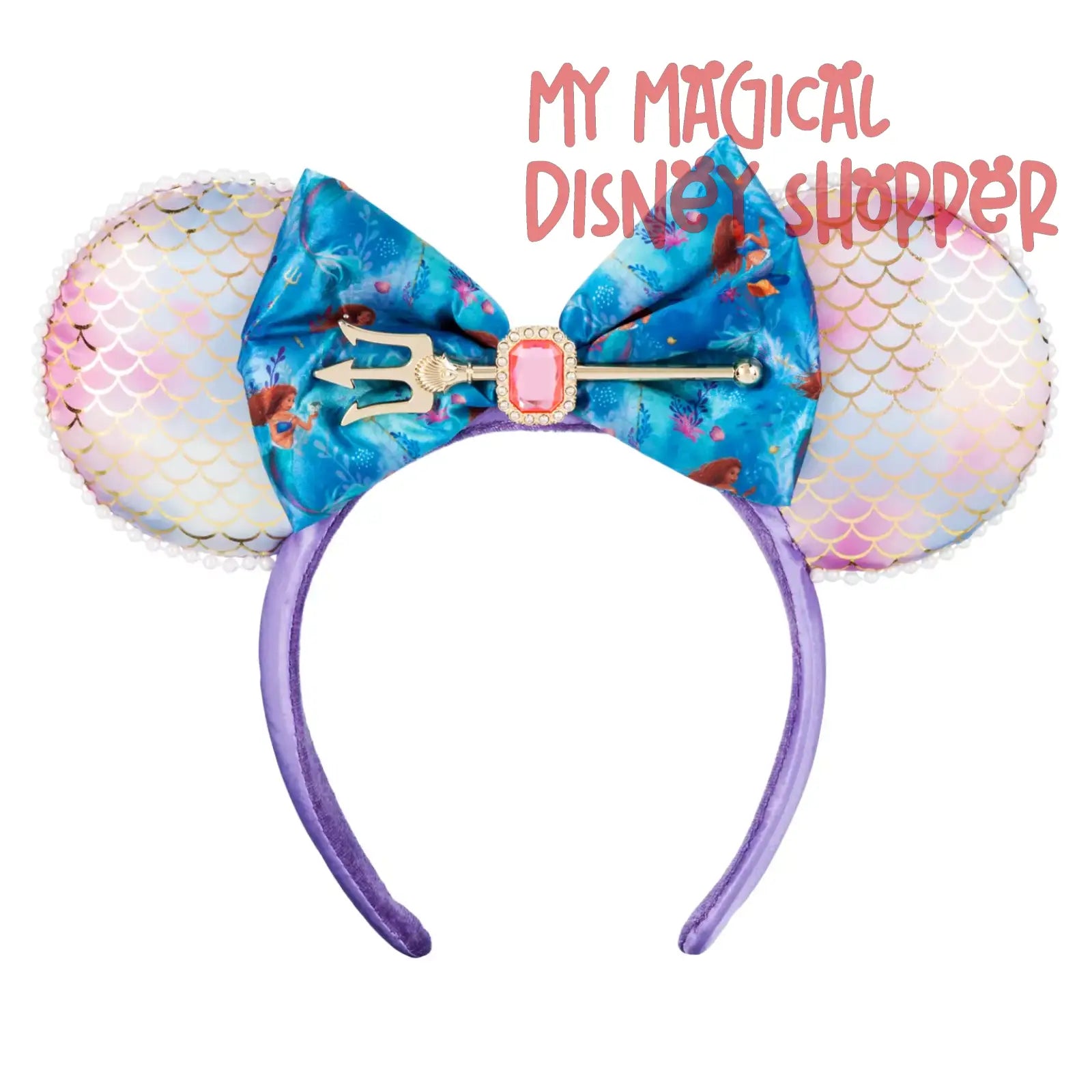Inspired by Disney's live action version of The Little Mermaid, the soft satin padded ears have an allover golden scale pattern while Ariel is featured in the print on the blue satin bow. A bejeweled trident brooch decorates the bow's knot so you'll be ready for the next fashion wave.