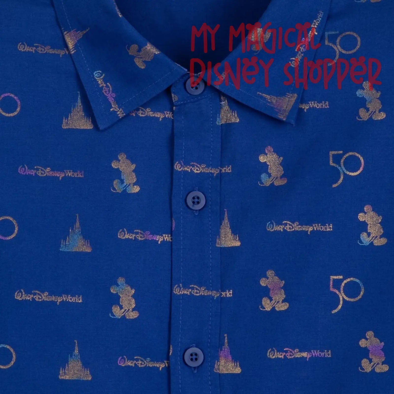 Celebrate 50 happy years of The Most Magical Place on Earth in this button-down camp shirt pixie-dusted with a gleaming golden pattern featuring Mickey Mouse and Cinderella Castle icons, plus the official Walt Disney World ''50'' logo.