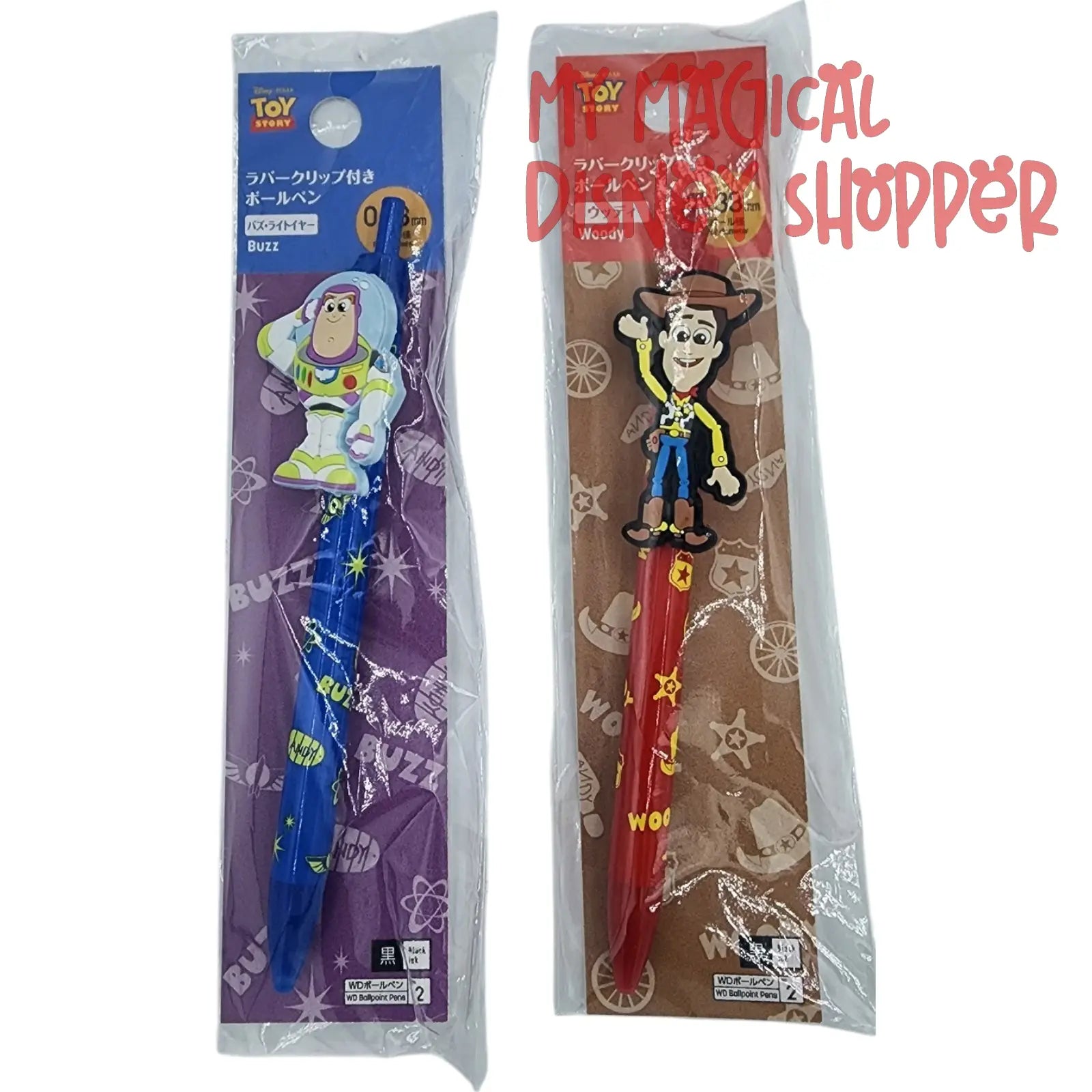 Each pen features a convenient click mechanism for effortless use, and an accompanying rubber charm clip shaped as Buzz or Woody, adding a playful touch to your everyday tasks.